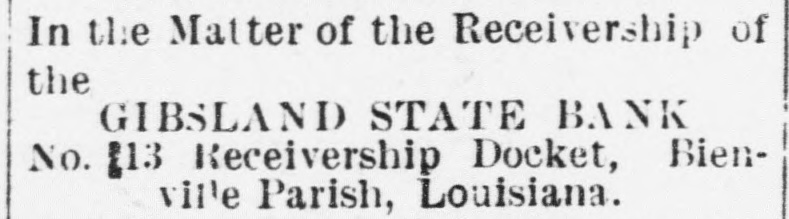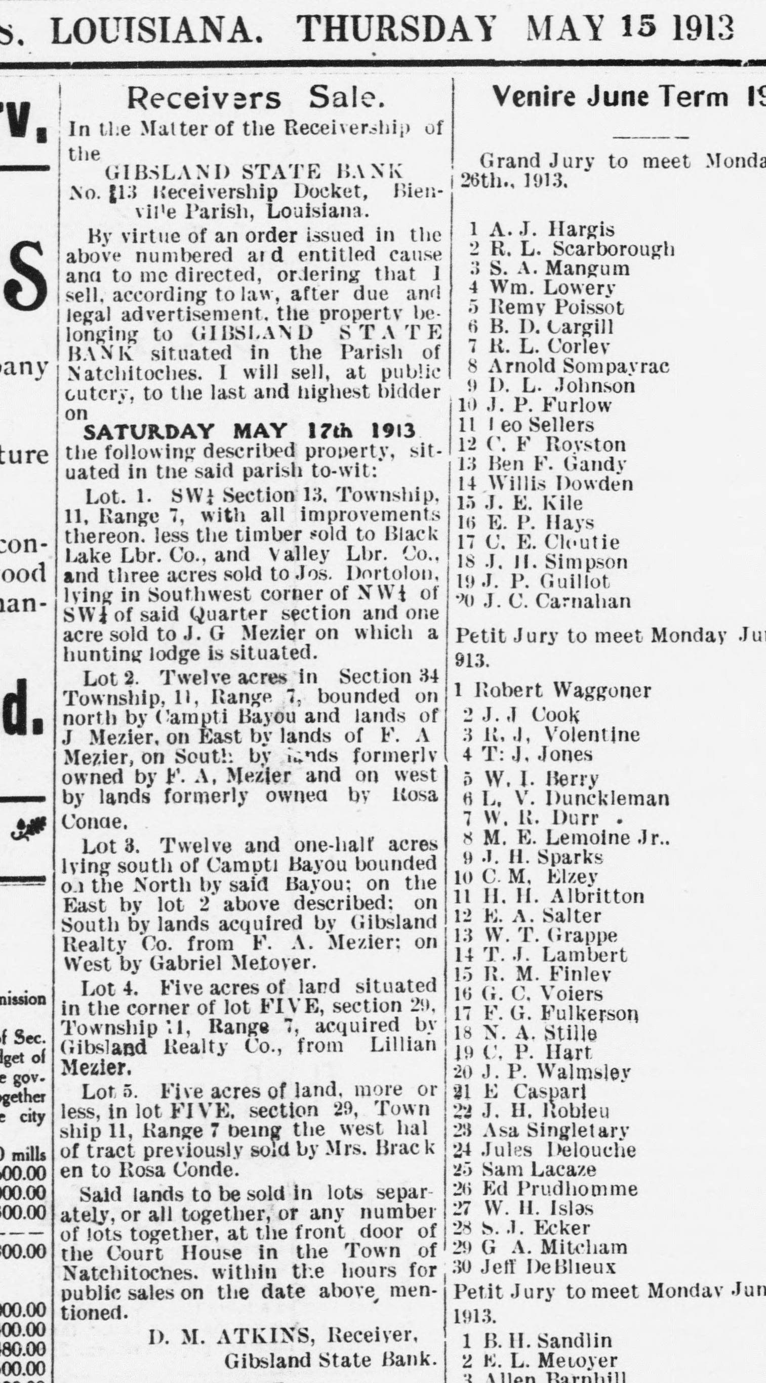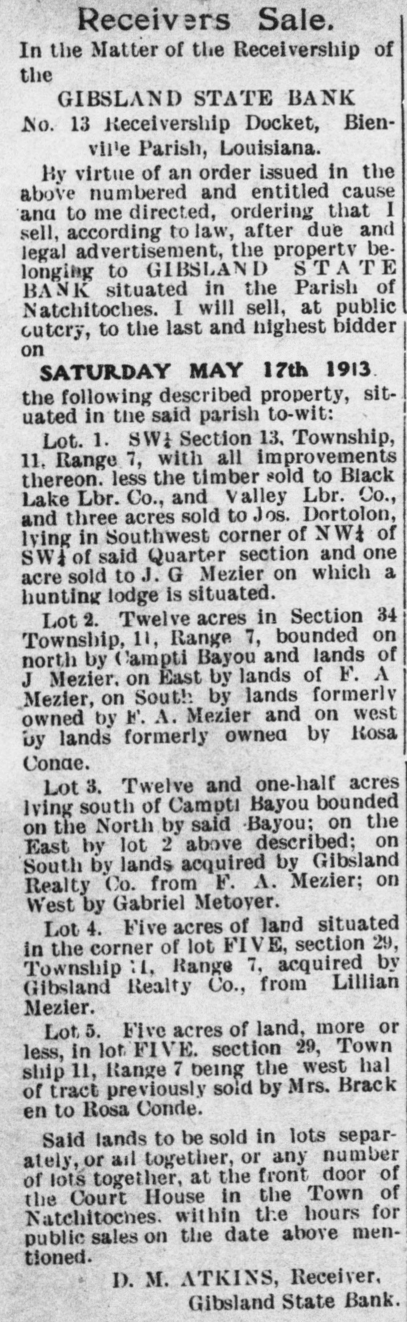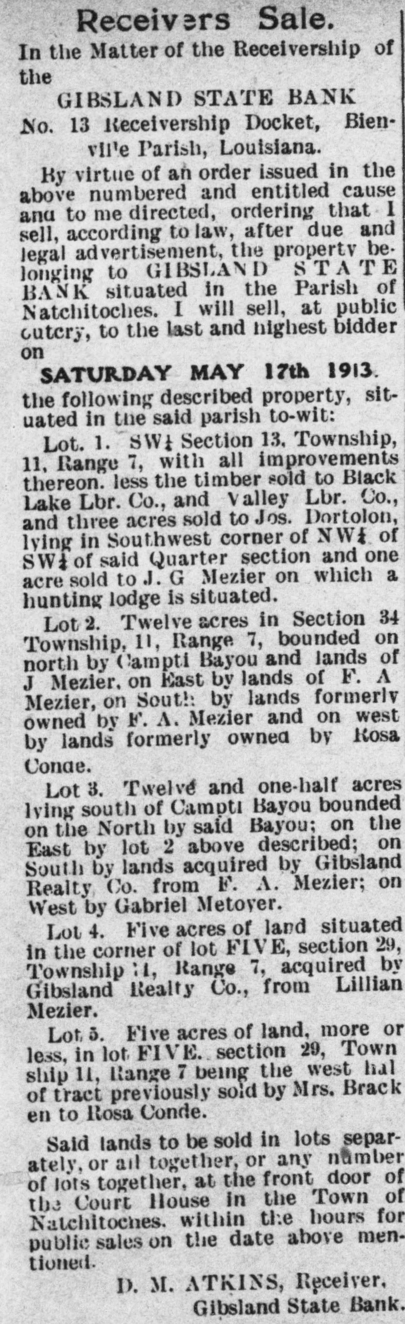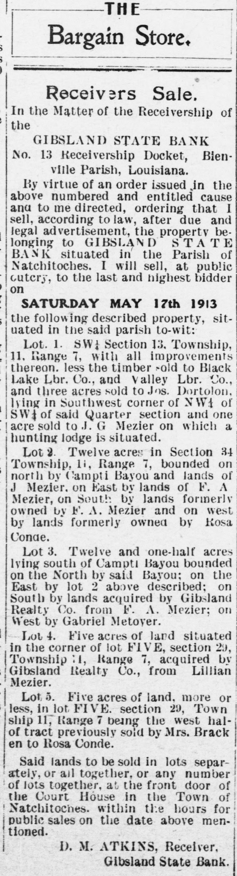 THE Bargain Store. Receivers Sale. In the Matter of the Receivership of the GIBSLAND STATE BANK No. 13 Receivership Docket, Bienville Parish, Louisiana. By virtue of an order issued in the above numbered and entitled cause and to me directed, ordering that I sell, according to law, after due and legal advertisement, the property belonging to GIBSLAND STATE BANK situated in the Parish of Natchitoches. I will sell, at public outery, to the last and highest bidder on SATURDAY MAY 17th 1913 the following described property, situated in the said parish to-wit: Lot. 1. SW₄ Section 13. Township, 11, Range 7, with all improvements thereon. less the timber sold to Black Lake Lbr. Co., and Valley Lbr. Co., and three acres sold to Jos. Dortolon, lying in Southwest corner of NW4 of SW of said Quarter section and one acre sold to J. G Mezier on which a hunting lodge is situated. Lot 2. Twelve acres in Section 34 Township, 11, Range 7, bounded on north by Campti Bayou and lands of J Mezier. on East by lands of F. A Mezier, on South by lands formerly owned by F. A. Mezier and on west by lands formerly owned by Rosa Conae. Lot 3. Twelve and one-half acres lying south of Campti Bayou bounded on the North by said Bayou: on the East by lot 2 above described: on South by lands acquired by Gibsland Realty Co. from F. A. Mezier; on West by Gabriel Metoyer. Lot 4. Five acres of land situated in the corner of lot FIVE, section 29, Township :1, Range 7, acquired by Gibsland Realty Co., from Lillian Mezier. Lot 5. Five acres of land, more or less, in lot FIVE. section 29, Town ship 11, Range 7 being the west halof tract previously sold by Mrs. Brack en to Rosa Conde. Said lands to be sold in lots separately, or all together, or any number of lots together, at the front door of the Court Hóuse in the Town of Natchitoches. within the hours for public sales on the date above mentioned. D. M. ATKINS, Receiver, Gibsland State Bank.