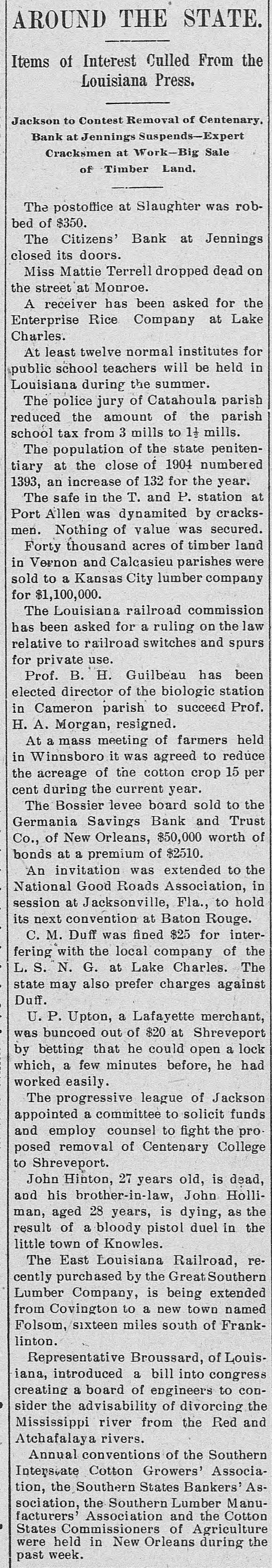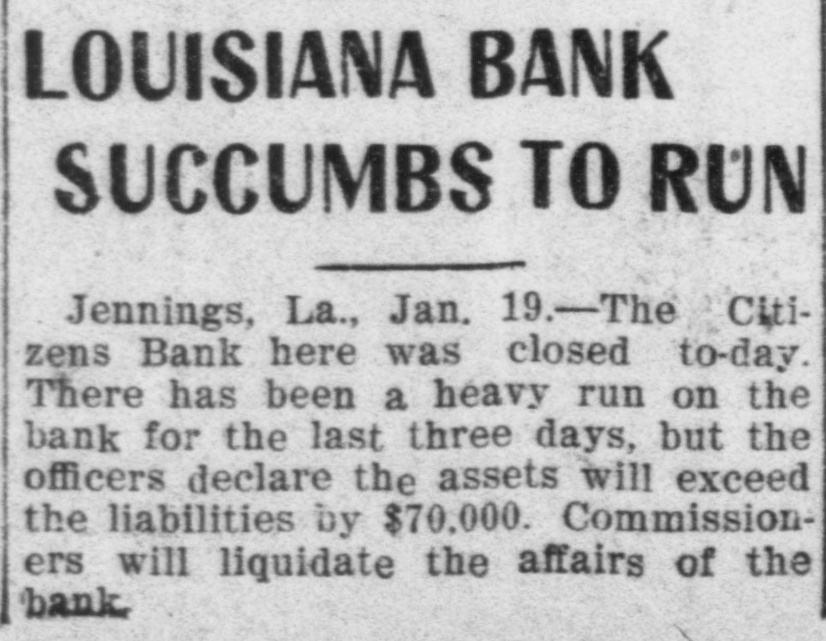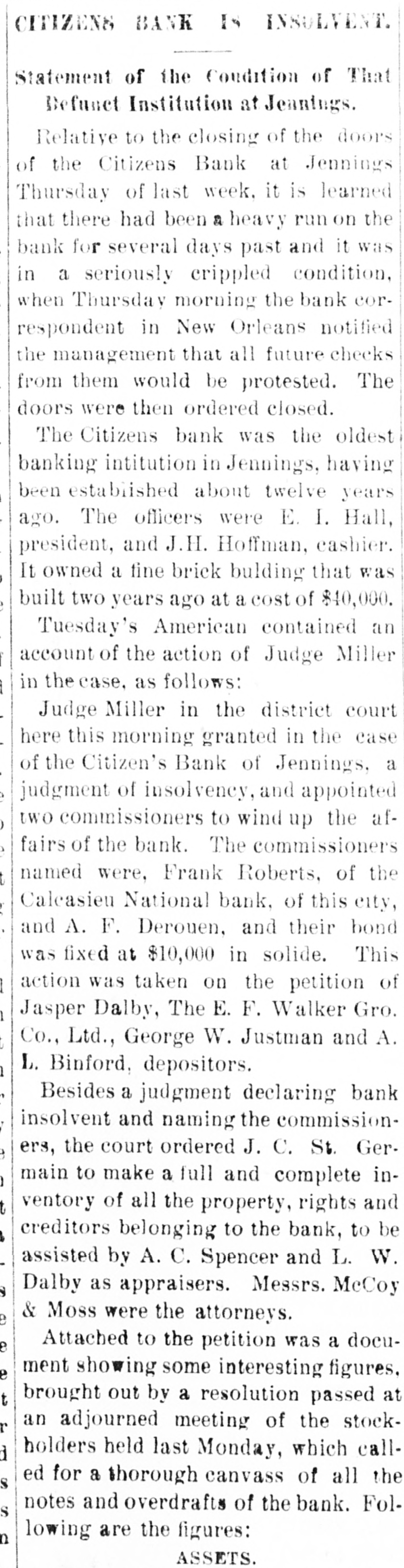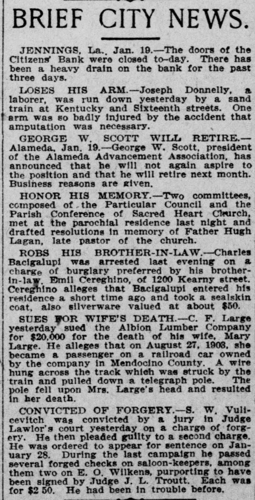 BRIEF CITY NEWS. JENNINGS, La.. Jan. 19.-The doors of the Citizens' Bank were closed to-day. There has been a heavy drain on the bank for the past three days. LOSES HIS ARM.-Joseph Donnelly, a laborer, was run down yesterday by a sand train at Kentucky and Sixteenth streets. One arm was so badly injured by the accident that amputation was necessary. GEORGE W. SCOTT WILL RETIRE.Alameda, Jan. 19.-George W. Scott, president of the Alameda Advancement Association, has announced that he will not again aspire to the position and that he will retire next month. Business reasons are given. HONOR HIS MEMORY.-Two committees, composed of the Particular Council and the Parish Conference of Sacred Heart Cherch, met at the parochial residence last night and drafted resolutions in memory of Father Hugh Lagan, late pastor of the church. ROBS HIS BROTHER-IN-LAW.- Charles Bacigalupi was arrested last evening on a charge of burglary preferred by his brotherin-law. Emil Cereghino, of 1200 Kearny street. Cereghino alleges that Bacigalupi entered his residence a short time ago and took a sealskin coat, also silverware valued at about $50. SUES FOR WIFE'S DEATH.-C. F. Large yesterday sued the Albion Lumber Company for $20,000 for the death of his wife, Mary Large. He alleges that on August 27, 1903, she became a passenger on a railroad car owned by the company in Mendocino County. A wire hung across the track which was struck by the train and pulled down a telegraph pole. The pole fell upon Mrs. Large's head and resulted in her death. CONVICTED OF FORGERY.-S. W. Vulicevitch was convicted by a jury in Judge Lawlor's court yesterday on a charge of forgery. He then pleaded guilty to a second charge. He was ordered to appear for sentence on January 28. During the last campaign he passed several forged checks on saloon-keepers, among them two on E. o. Wilkens, purporting to have been signed by Judge J. L. Troutt. Each was for $2 50. He had been in trouble before.