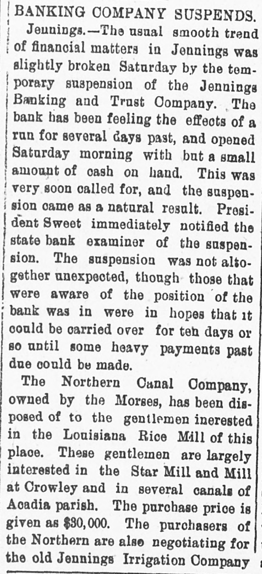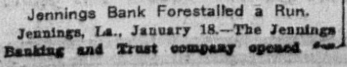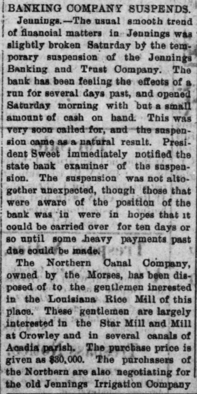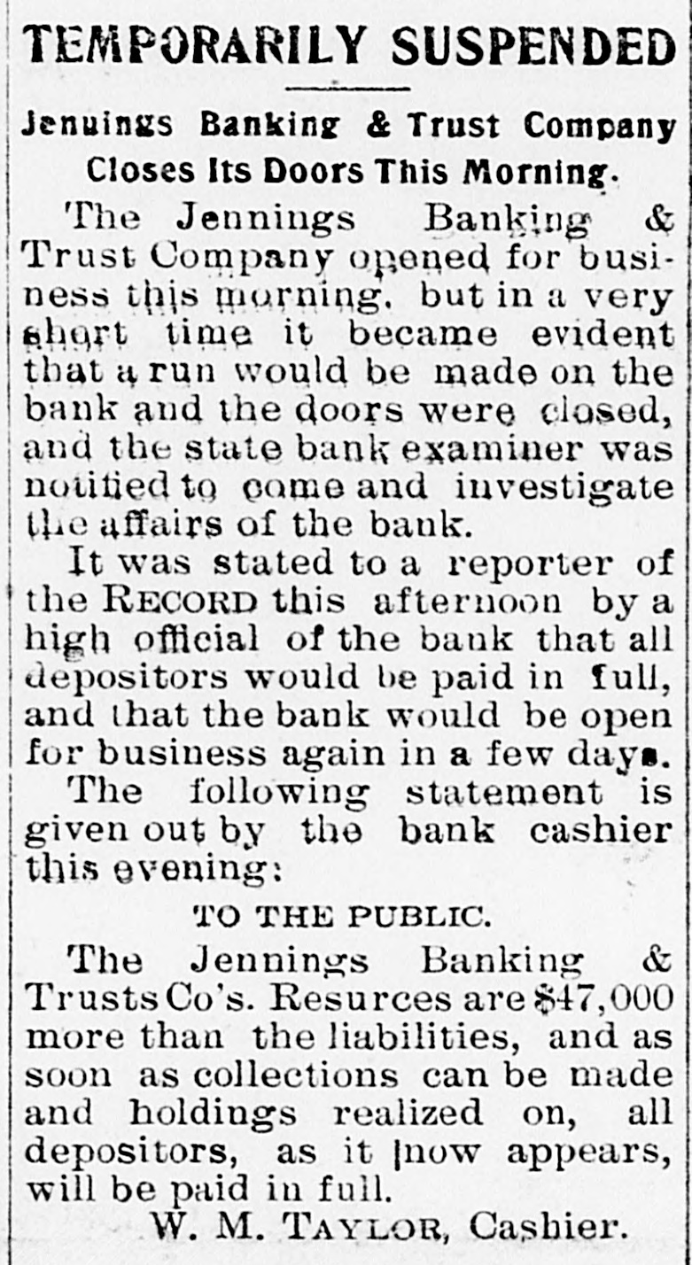 TEMPORARILY SUSPENDED Jenuings Banking & Trust Company Closes Its Doors This Morning. The Jennings Banking & Trust Company opened for business this morning. but in a very short time it became evident that a run would be made on the bank and the doors were closed, and the state bank examiner was notified to come and investigate the affairs of the bank. It was stated to a reporter of the RECORD this afternoon by a high official of the bank that all depositors would be paid in full, and that the bank would be open for business again in a few days. The following statement is given out by the bank cashier this evening: TO THE PUBLIC. The Jennings Banking & Trusts Co's. Resurces are $47,000 more than the liabilities, and as soon as collections can be made and holdings realized on, all depositors, as it |now appears, will be paid in full. W. M. TAYLOR, Cashier.