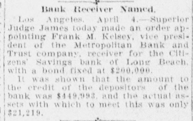 Frank M. Kelsey to-day was appointed receiver for the Citizens Savings Bank of Long Beach ... amount to the credit of the depositors of the bank was $449,993 and the actual cash assets ... only $21,219.