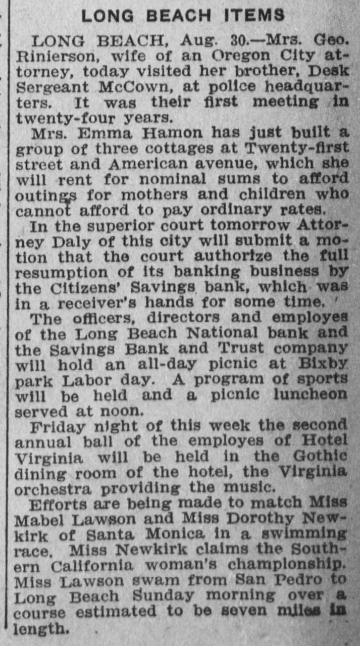 LONG BEACH ITEMS LONG BEACH, Aug. 30.-Mrs. Geo. Rinierson, wife of an Oregon City attorney, today visited her brother, Desk Sergeant McCown, at police headquarters. It was their first meeting in twenty-four years. Mrs. Emma Hamon has just built a group of three cottages at Twenty-first street and American avenue, which she will rent for nominal sums to afford outings for mothers and children who cannot afford to pay ordinary rates. In the superior court tomorrow Attorney Daly of this city will submit a motion that the court authorize the full resumption of its banking business by the Citizens' Savings bank, which was in a receiver's hands for some time. The officers, directors and employes of the Long Beach National bank and the Savings Bank and Trust company will hold an all-day picnic at Bixby park Labor day. A program of sports will be held and a picnic luncheon served at noon. Friday night of this week the second annual ball of the employes of Hotel Virginia will be held in the Gothic dining room of the hotel, the Virginia orchestra providing the music. Efforts are being made to match Miss Mabel Lawson and Miss Dorothy Newkirk of Santa Monica in a swimming race. Miss Newkirk claims the Southern California woman's championship. Miss Lawson swam from San Pedro to Long Beach Sunday morning over a course estimated to be seven miles in length.