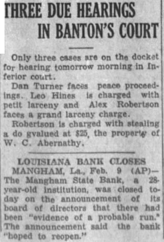 THREE DUE HEARINGS IN BANTON'S COURT Only three cases are on the docket for hearing tomorrow morning in ferior court. Dan Turner faces peace proceedLeo Hines charged with petit larceny Alex grand larceny charge. Robertson charged gvalued the property Abernathy. LOUISIANA BANK CLOSES MANGHAM, The Mangham State Bank, year-old institution, closed day the board directors that there had been "evidence of probable run." The said the to reopen."