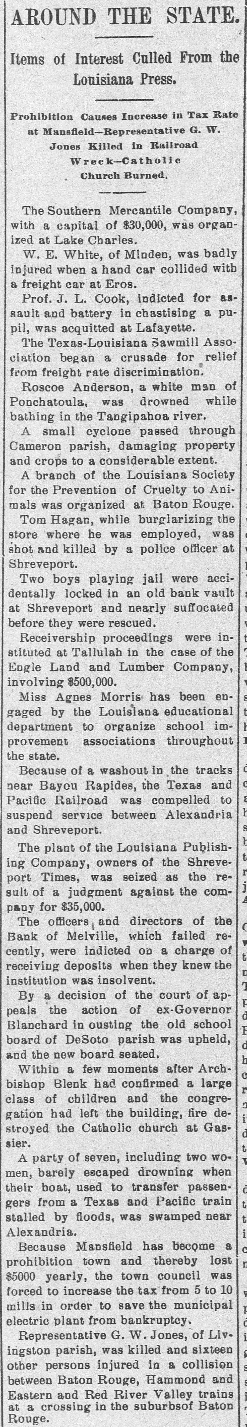 AROUND THE STATE. Items of Interest Culled From the Louisiana Press. Prohibition Causes Increase in Tax Rate at Mansfield-Representative G. W. Jones Killed in Railroad Wreck-Catholic Church Burned, The Southern Mercantile Company, with a capital of $30,000, was organized at Lake Charles. W. E. White, of Minden, was badly injured when a hand car collided with a freight car at Eros. Prof. J. L. Cook, indicted for assault and battery in chastising a pupil, was acquitted at Lafayette. The Texas-Louisiana Sawmill Association began a crusade for relief from freight rate discrimination. Roscoe Anderson, a white man of Ponchatoula, was drowned while bathing in the Tangipahoa river. A small cyclone passed through Cameron parish, damaging property and crops to a considerable extent. A branch of the Louisiana Society for the Prevention of Cruelty to Animals was organized at Baton Rouge. Tom Hagan, while burglarizing the store where he was employed, was shot and killed by a police officer at Shreveport. Two boys playing jail were accidentally locked in an old bank vault at Shreveport and nearly suffocated before they were rescued. Receivership proceedings were instituted at Tallulah in the case of the Engle Land and Lumber Company, involving $500,000. Miss Agnes Morris has been engaged by the Louisiana educational department to organize school improvement associations throughout the state. d Because of a washout in the tracks C near Bayou Rapides, the Texas and a Pacific Railroad was compelled to h suspend service between Alexandria S and Shreveport. The plant of the Louisiana Publishing Company, owners of the Shreveport Times, was seized as the result of a judgment against the company for $35,000. The officers and directors of the ( Bank of Melville, which failed recently, were indicted OD a charge of t receiving deposits when they knew the institution was insolvent. By a decision of the court of appeals the action of ex-Governor d Blanchard in ousting the old school E board of DeSoto parish was upheld, and the new board seated. b Within a few moments after Archbishop Blenk had confirmed a large class of children and the congregation had left the building, fire destroyed the Catholic church at Gassier. A party of seven, including two women, barely escaped drowning when their boat, used to transfer passent gers from a Texas and Pacific train stalled by floods, was swamped near Alexandria. Because Mansfield has become a c prohibition town and thereby lost $5000 yearly, the town council was forced to increase the tax from 5 to 10 mills in order to save the municipal electric plant from bankruptcy. Representative G. W. Jones, of Livingston parish, was killed and sixteen other persons injured in a collision between Baton Rouge, Hammond and Eastern and Red River Valley trains at a crossing in the suburbsof Baton Rouge.