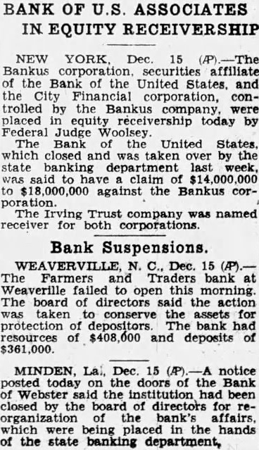 BANK OF U.S. ASSOCIATES IN EQUITY RECEIVERSHIP NEW YORK. Dec. 15 (AP) The securities affiliate of the Bank of the United States. and the City corporation, controlled by the Bankus company. placed in receivership today by Federal Judge Woolsey Bank of United States, which closed and was taken by the state banking department last week, was $14,000,000 to $18,000,000 against the Bankus corporation. The Irving Trust company named receiver for both corporations Bank Suspensions. N. C., Dec. 15 (AP) Farmers and Traders bank at Weaverille failed to open this morning. The board of directors said the action was taken to conserve the assets for protection of depositors. The bank had resources of $408.000 and deposits of MINDEN, La., Dec. 15 (AP) notice on the doors of the Bank of aid the institution had been closed by the board of directors for reorganization of the bank's affairs, which were being placed in the hands of the state banking department,