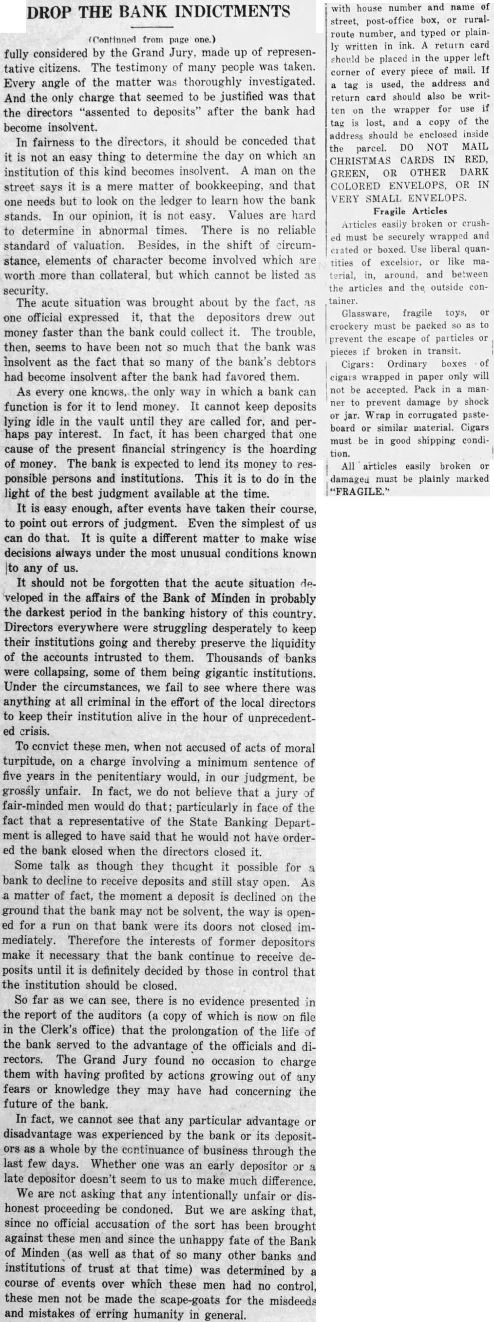 DROP THE BANK INDICTMENTS (Continued from page one.) fully considered by the Grand Jury, made up of representative citizens. The testimony of many people was taken. Every angle of the matter was thoroughly investigated. And the only charge that seemed to be justified was that the directors "assented to deposits" after the bank had become insolvent. In fairness to the directors, it should be conceded that it is not an easy thing to determine the day on which an institution of this kind becomes insolvent. A man on the street says it is a mere matter of bookkeeping, and that one needs but to look on the ledger to learn how the bank stands. In our opinion, it is not easy. Values are hard to determine in abnormal times. There is no reliable standard of valuation. Besides, in the shift of circumstance, elements of character become involved which are worth more than collateral, but which cannot be listed as security. The acute situation was brought about by the fact, as one official expressed it, that the depositors drew out money faster than the bank could collect it. The trouble, then, seems to have been not so much that the bank was insolvent as the fact that so many of the bank's debtors had become insolvent after the bank had favored them. As every one knows, the only way in which a bank can function is for it to lend money. It cannot keep deposits lying idle in the vault until they are called for, and perhaps pay interest. In fact, it has been charged that one cause of the present financial stringency is the hoarding of money. The bank is expected to lend its money to responsible persons and institutions. This it is to do in the light of the best judgment available at the time. It is easy enough, after events have taken their course, to point out errors of judgment. Even the simplest of us can do that. It is quite a different matter to make wise decisions always under the most unusual conditions known to any of us. It should not be forgotten that the acute situation developed in the affairs of the Bank of Minden in probably the darkest period in the banking history of this country. Directors everywhere were struggling desperately to keep their institutions going and thereby preserve the liquidity of the accounts intrusted to them. Thousands of banks were collapsing, some of them being gigantic institutions. Under the circumstances, we fail to see where there was anything at all criminal in the effort of the local directors to keep their institution alive in the hour of unprecedented crisis. To convict these men, when not accused of acts of moral turpitude, on a charge involving a minimum sentence of five years in the penitentiary would, in our judgment, be grossly unfair. In fact, we do not believe that a jury of fair-minded men would do that; particularly in face of the fact that a representative of the State Banking Department is alleged to have said that he would not have ordered the bank closed when the directors closed it. Some talk as though they thought it possible for a bank to decline to receive deposits and still stay open. As a matter of fact, the moment a deposit is declined on the ground that the bank may not be solvent, the way is opened for a run on that bank were its doors not closed immediately. Therefore the interests of former depositors make it necessary that the bank continue to receive deposits until it is definitely decided by those in control that the institution should be closed. So far as we can see, there is no evidence presented in the report of the auditors (a copy of which is now on file in the Clerk's office) that the prolongation of the life of the bank served to the advantage of the officials and directors. The Grand Jury found no occasion to charge them with having profited by actions growing out of any fears or knowledge they may have had concerning the future of the bank. In fact, we cannot see that any particular advantage or disadvantage was experienced by the bank or its depositors as a whole by the continuance of business through the last few days. Whether one was an early depositor or a late depositor doesn't seem to us to make much difference. We are not asking that any intentionally unfair or dishonest proceeding be condoned. But we are asking that, since no official accusation of the sort has been brought against these men and since the unhappy fate of the Bank of Minden (as well as that of SO many other banks and institutions of trust at that time) was determined by a course of events over which these men had no control, these men not be made the scape-goats for the misdeeds and mistakes of erring humanity in general. house number and name of with route number, and typed or plain- den: Mrs ENVELOPS, OR IN COLORED VERY SMALL ENVELOPS. Fragile Articles Articles broken or crusheasily be securely wrapped and ed must crated or boxed. Use liberal quantities of excelsior, or like material, in, around, and between the articles and the outside container. Glassware, fragile toys, or must be packed so as to crockery prevent the escape of particles or pieces if broken in transit. Cigars: Ordinary boxes of wrapped in only will cigars paper not be accepted. Pack in man ner to prevent damage by shock or jar. Wrap in corrugated pasteboard or similar material. Cigars must be in good shipping condition. All articles easily broken or damaged must be plainly marked "FRAGILE."