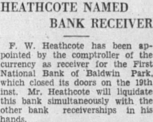 HEATHCOTE NAMED BANK RECEIVER F. W. Heathcote has been appointed by the comptroller of the currency as for the First National Bank of Baldwin Park. which closed its doors on the 19th inst. Mr. Heathcote will liquidate this bank simultaneously with the other bank receiverships in his hands.