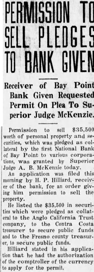 PERMISSION TO SELL PLEDGES BANK GIVEN Receiver of Bay Point Bank Given Requested Permit On Plea To Superior Judge McKenzie. Permission to sell $35,500 worth of personal property and securities, which was pledged as collateral by the first National Bank of Bay Point to various corporations, was granted by Superior Judge A. B. McKenzie today. An application was filed this morning by H. P. Hilliard, receivof the bank, for an order giving him permission to sell the property. He listed the $35,500 in securities which were pledged as collateral to the Anglo California Trust company, to the Contra Costa treasurer to secure public funds and to the Fresno county treasurer, to secure public funds. Hilliard stated in his application that he had the authorization of the comptroller of the currency apply for the permit.