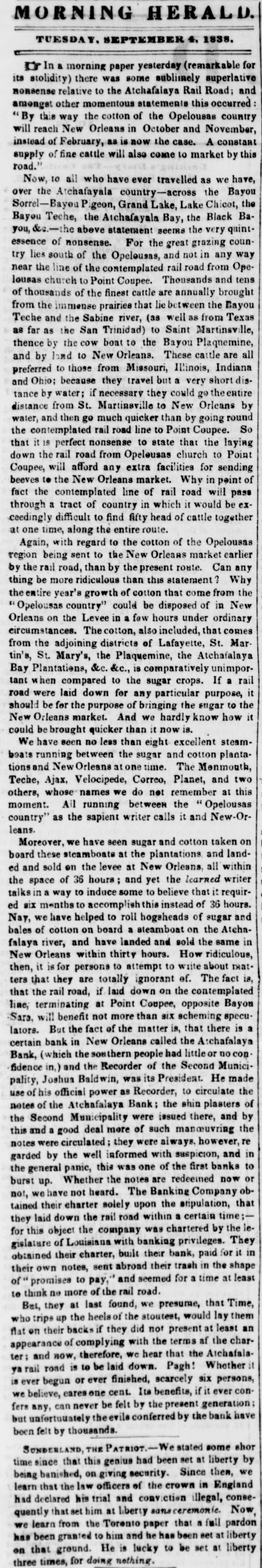 MORNING HERALD. TUESDAY. SEPTEMBER 4. 1838. Dr In a morning paper yesterday (remarkable fo its stolidity) there was some sublimely superlative nonsense relative to the Atchafalaya Rail Road; amongst other momentous statements this occurred By this way the cotton of the Opelousas country will reach New Orleans in October and November, instead of February, as now the case. A constant this supply of fine cattle will also come to market by road. Now, to all who have ever travelled as we have, over the Atchafayala country-across the Bayou the Sorrel-Bayeu Pigeon, Grand Lake, Lake Chicot, BaBayou Teche, the Atchafayala Bay, the Black you, &c.-the above statement seems the very quintessence of nonsense. For the great grazing country lies south of the Opeleusas, and not in any way near the line of the contemplated rail road from Opelousas church to Point Coupee. Thousands and tens of thousands of the finest cattle are annually brought from the immense prairies that lie between the Bayou Texas Teche and the Sabine river, (as well as from as far as the San Trinidad) to Saint Martinsville, thence by the cow boat to the Bayou Plaqnemine, all and by land to New Orleans. These cattle Indiana are preferred to those from Missouri, Illinois, Ohio; because they travel but a very short disand by water; if necessary they could go the entire distance tance from St. Martinsville to New Orleans by and then ge much quicker than by going round So the water, contemplated rail road line to Point Coupee. that it is perfect nonsense to state that the laying down the rail road from Opeleusas church to Point Coupee, will afford any extra facilities for sending beeves to the New Orleans market. Why in point of fact the contemplated line of rail road will pass through a tract of country in which it would be exceedingly difficult to find fifty head of cattle together at one time, along the entire route. Again, with regard to the cotton of the Opelousas earlier region being sent to the New Orleans market by the rail road, than by the present route. Can any thing be more ridiculous than this statement? Why the entire year's growth of cotton that come from New the " could be disposed of in the Levee in a few hours The cotton, also circumstances. Orleans Opelousas on country" included, under that ordinary comes Marfrom the adjoining districts of Lafayette, St. tin's, St. Mary's, the Plaquemine, the Atchafalaya Bay Plantations, &c. &c., is comparatively unimpor- rail tant when compared to the sugar crops. If a road were laid down for any particular purpose, it should be for the purpose of bringing the sugar to the it New Orleans market. And we hardly know how could be brought quicker than it now is. We have seen no less than eight excellent steambeats running between the sugar and cotton plantations and New Orleans at one time. The Menmouth, Teche, Ajax, Velocipede, Correo, Planet, and two this others, whose names we do not remember at moment. All running between the Opelousas country" as the sapient writer calls it and New-Orleans. Moreover, we have seen sugar and cotton taken on board these steamboats at the plantations and landed and sold on the levee at New Orleans, all within the space of 36 hours ; and yet the learned writer taiks in a way to induce some to believe that it required six months to accomplish this instead of 36 hours. Nay, we have helped to roll hogsheads of sugar and bales of cotton on board a steamboat on the Atehafalaya river, and have landed and sold the same in New Orleans within thirty hours. How ridiculous, then, it is for persons to attempt to write about thatters that they are totally ignorant of. The fact is, that the rail road, if laid down on the contemplated line, terminating at Point Coupee, opposite Bayon Sara, will benefit not more than six scheming specu- a lators. But the fact of the matter is, that there is certain bank in New Orleans called the Atchafalaya the southern people had little or no con. and the Recorder of the Joshua Baldwin, was its pality, fidence Bank, (which in,) President. Second circulate He Munici- made the use of his official power as Recorder, to of notes of the Atchafalaya Bank; the shin plasters Second Municipality were issued there, and the by the this and a good deal more of such manœuvring were circulated they were always, however, notes garded by the well informed with suspicion, and to in the general panie, this was one of the first banks or burst up. Whether the notes are redeemed now obwe have not heard. The Banking Company that tained not, their charter solely upon the atipulation, laid down the rail road within a certain time; iethey this object the company was chartered by the They for gislature of Louisiana with banking privileges. for it obtained their charter, built their bank, paid in notes, sent abroad their trash in the shape their of promises own to pay," and seemed for a time at least to think ne more of the rail road. they at last found, we presume, that Time, Bet, trips up the heels of the stoutest, would lay them who their backs if they did not present at least char- an flat on of complying with the terms af the appearance and now, therefore, we hear that the Atchafalater; road is to be laid down. Pagh! Whether yarail ever begun or ever finished, scarcely six persons, is believe, eares one cent. Its benefits, if it ever confers we can never be felt by the present generation; have but unfertuuately any, the evile conferred by the bank been felt by thousands. SUNDERLAND, THE Patrior.-We stated some shor since that this genius had been set at liberty by time banished, on giving security. Since then, we being learn that the law officers of the crown in England had declared his trial and conviction illegal, consequently that set him at liberty sansceremonic. Now from the Torento paper that a fall pardon to him and he has been set at He is lucky to be set at has on we that learn been ground. granted liberty liberty three times, for doing nothing.