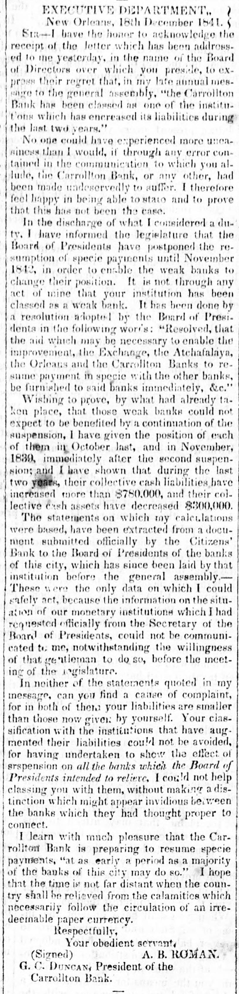EXECUTIVE DEPARTMENT. New Orleans, 18th December 1841. Sta-1 have the honor to acknowledge the receipt of the letter which has been addressed to me yesterday, in the name of the Board of Directors over which you preside, to express their regret that, in my late annual mesange to the general assembly, "the Carrollton Bank has been classed an one of the institutotal which has encreased its liabilities during the last two years." No one could have experienced more uncasinces than I would, if through any error contained in the communication to which you allude, the Carrollton Bank, or any other, had been made undeservedly to suffer. I therefore feel happy in being able to stato and to prove that this has not been the case. In the discharge of what I considered a dutv. I have informed the legielature that the Board of Presidents have postponed the resumption of specie payments until November 1842, in order to enable the weak banks to change their position. It is not through any act of mine that your institution has been classed as a weak bank. It has been done by a resolution adopted by the Board of Presidenta in the following words: "Resolved, that the aid which may be necessary to enable the improvement, the Exchange, the Atchafalaya, the Orleans and the Carrollton Banks to resame payment in specie with the other banks, be furnished to said banks immediately, &c." Wishing to prove, by what had already taken place, that those weak banks could not expect to be benefited by a continuation of the suspension, I have given the position of each of them in October last, and in November, 1839, immediately after the second suspension; and I have shown that during the last two years, their collective cash liabilities have increased more than $780,000, and their collective cash assets have decreased $300,000. The statements on which my calculations were based, have been extracted from a document submitted officially by the Citizens' Bank to the Board of Presidents of the banks of this city, which has since been laid by that institution before the general assembly.These were the only data on which I could safely act, because the information on the situation of our monetary institutions which had requested officially from the Secretary of the Board of Presidents, could not be communicated to me, notwithstanding the willingness of that gentleman to do so, before the inceting of the legislature. In neither of the statements quoted in my message, can you find a cause of complaint, for in both of there your liabilities are smaller than those now given by yourself. Your classification with the institutions that have augmented their liabilities could not be avoided, for having undertaken to show the effect of srspension on all the banks which the Board of Presidents intended to relieve. I could not help classing you with them, without making a distinction which might appear invidious between the banks which they had thought proper to connect. I learn with much pleasure that the Carrollton Bank is preparing to resume specie payments, "at as early a period as a majority of the banks of this city may do so." I hope that the time is not far distant when the country shall be relieved from the calamities which necessarily follow the circulation of an irredeemable paper currency. Respectfully, Your obedient servant. A. B. ROMAN. (Signed) G.C. DUNCAN, President of the Carrollton Bank.