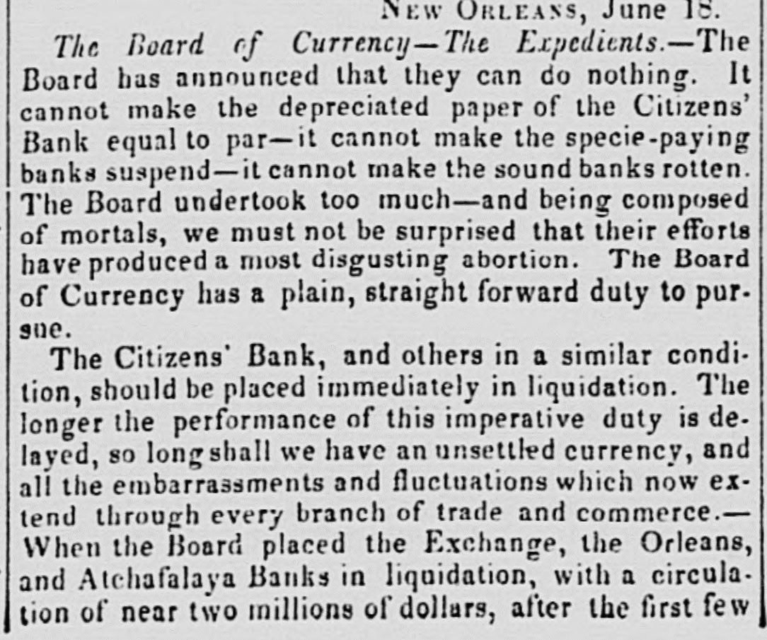 NEW ORLEANS, June 18. The Board of Currency- The Expedients.-The Board has announced that they can do nothing. It cannot make the depreciated paper of the Citizens' Bank equal to par- it cannot make the specie-paying banks suspend- it cannot make the sound banks rotten. The Board undertook too much-and being composed of mortals, we must not be surprised that their efforts have produced a most disgusting abortion. The Board of Currency has a plain, straight forward duty to pursue. The Citizens' Bank, and others in a similar condition, should be placed immediately in liquidation. The longer the performance of this imperative duty is delayed, 80 long shall we have an unsettled currency, and all the embarrassments and fluctuations which now extend through every branch of trade and commerce.When the Board placed the Exchange, the Orleans, and Atchafalaya Banks in liquidation, with a circula. tion of near two millions of dollars, after the first fev
