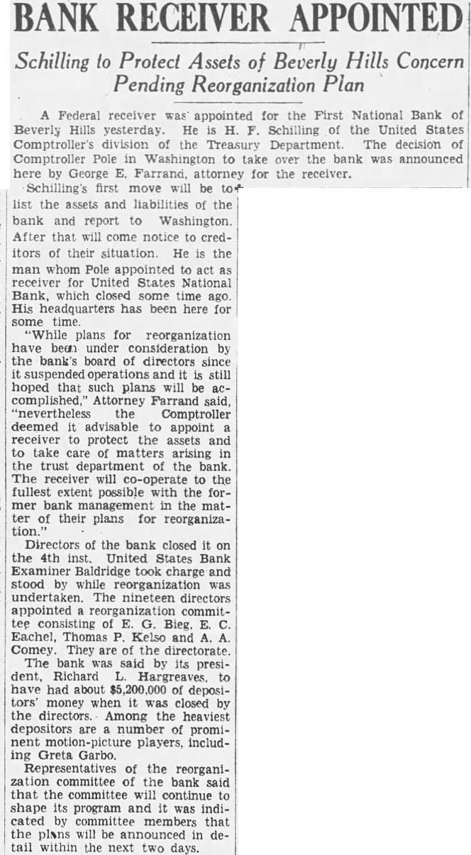A Federal receiver was appointed for the First National Bank of Beverly Hills yesterday. He H. F. Schilling of the United States Comptroller's division of the Treasury Department. The decision of Comptroller Pole in Washington to take over the bank was announced here by George E. Farrand, attorney for the receiver. list the assets and liabilities of the bank and report to Washington After that will come notice to creditors of their situation. He is the man whom Pole appointed to act as receiver for United States National Bank, which closed some time ago His headquarters has been here for some "While plans for reorganization have been under consideration by the bank's board of directors since suspended operations and it is still hoped that such plans will be accomplished, Attorney Farrand said, "nevertheless the Comptroller deemed it advisable to appoint receiver to protect the assets and to take care of matters arising in the trust department of the bank. The receiver will co-operate to the fullest extent possible with the former bank management in the matter of their plans for reorganizaDirectors of the bank closed it on the 4th United States Bank Examiner Baldridge took charge and stood by while reorganization was undertaken. The nineteen directors appointed a reorganization committee consisting of E. G. Bieg. E. C. Eachel, Thomas P. Kelso and A. A Comey They are of the directorate The bank was said by its president, Richard Hargreaves. to have had about $5,200,000 of depositors' money when it was closed by the directors. Among the heaviest depositors are number of prominent players, including Greta Representatives of the reorganization committee of the bank said that the committee will continue to shape its program and it was indicated by committee members that the plans will be announced in detail within the next two days.