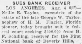 SUES BANK RECEIVER LOS Aug. Taylor, executrix of the estate the late George Taylor. nephew Flagler, Florida pioneer. today brought in fedcourt seeking from Schilling, receiver for the First National bank of Beverly Hills,