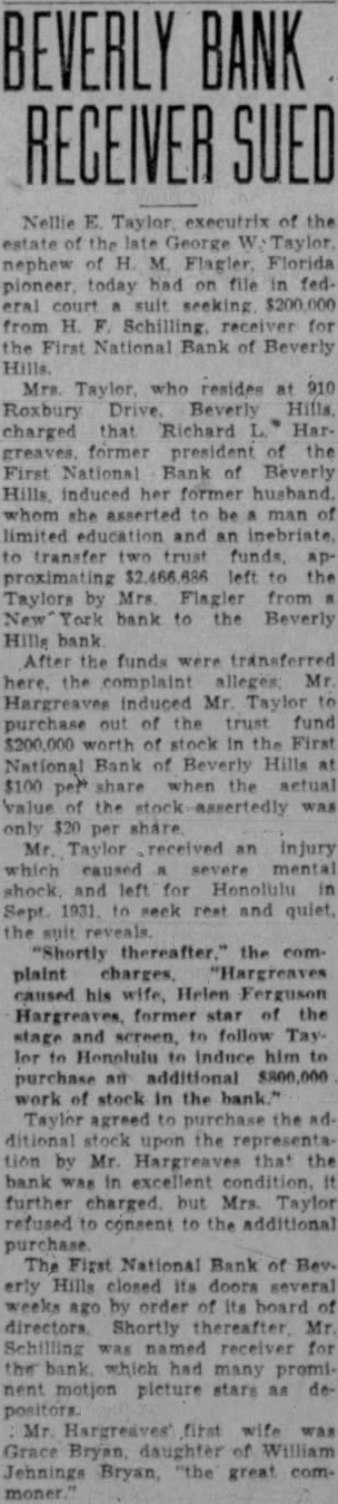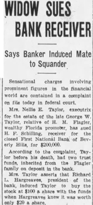 Sensational charges involving prominent figures in the financial world are contained in a complaint on file today in federal court. Mrs. Nellie E. Taylor, executrix for the estate of the late George W. Taylor, relative of H. M. Flagler, wealthy Florida promoter, has sued H. F. Schilling, receiver for the closed First National Bank of Beverly Hills, for $200,000. According to the complaint, Taylor before his death, had two trust funds, inherited from the Flagler family on deposit in the bank. Mrs. Taylor asserts that Richard L. Hargreaves, president of the bank, induced Taylor to buy the stock at $100 share with the funds when Hargreaves knew it was worth only $20 share.
