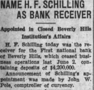 Schilling today was the receiver for the First national bank of Beverly Hills, which ceased busioperations last June containing deposits of $4,200,000. Announcement of Schilling's pointment was made by John Pole, comptroller of currency.