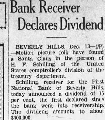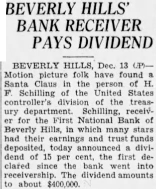 BEVERLY HILLS, Dec. 13 Motion picture folk have found Santa Claus the person of Schilling the United States controller's the treasury department. Schilling, receivFirst National Bank of Beverly Hills, which many stars their earnings trust funds deposited, today announced dividend per cent, first clared the bank went into receivership. dividend amounts about $400,000.