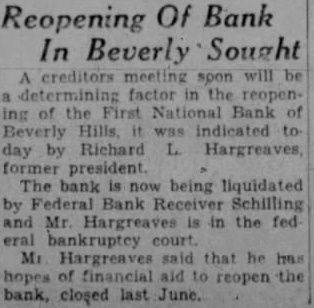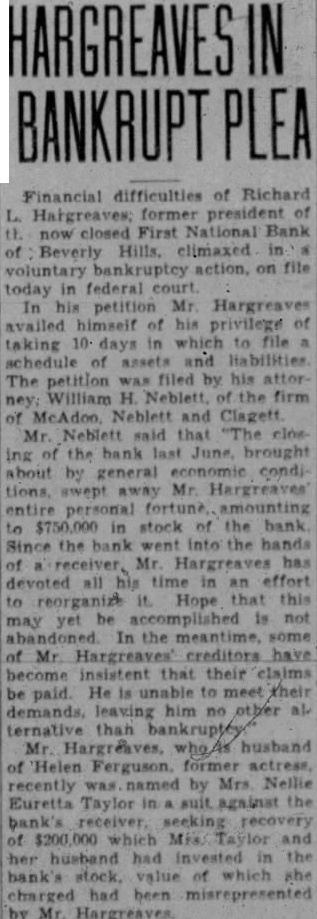 Financial difficulties of Richard First National Bank of Beverly Hills. climaxed action, on file today in federal petition Mr. Hargreaves availed himself of his privilege of taking days which file schedule assets and The petition was filed by his William H. the firm of McAdon Neblett and Clagett Mr. Neblett said that closthe bank last June. brought about by general conditions. swept away Mr. Hargreaves entire $750,000 in stock of the bank Since the bank Mr. Hargreaves devoted his to Hope this not In the Mr. Hargreaves' creditors that their be paid. He to meet their him other ternative than Hargreaves, husband Helen Ferguson. actress, recently by Nellie Euretta Taylor against the bank's seeking recovery which husband had invested which she been misrepresented by Mr.