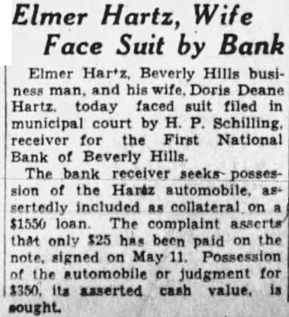 Elmer Har'z, Beverly Hills busiwife. Deane Hartz. today faced suit filed municipal court by Schilling. receiver First National Beverly Hills. bank receiver seeks possession Harez automobile. sertedly included collateral $1550 The complaint asserts that only $25 has on the signed on Possession judgment for asserted cash value. sought.