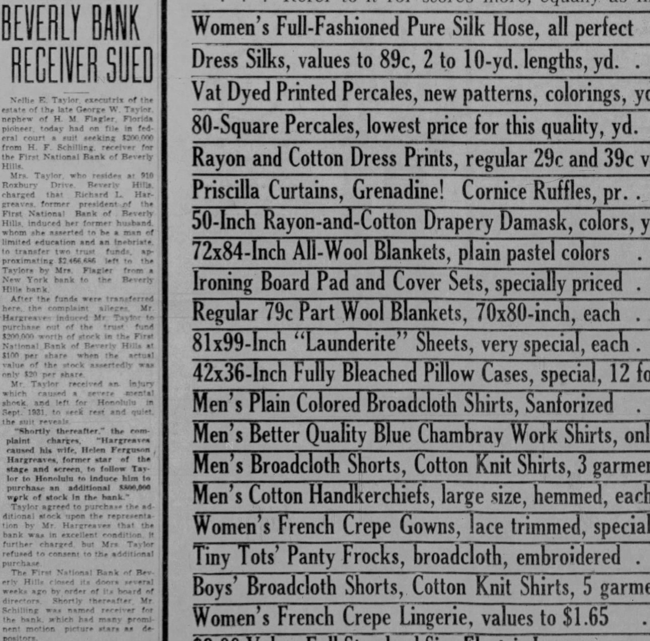 E Taylor executrix of the of the late George W file fed 80-Square Percales, lowest price for this quality, yd. today had in court suit seeking $200,000 from H. Schilling receiver for the First National Bank of Beverly Rayon and Cotton Dress Prints, regular 29c and 39c values 19c resides at 910 Beverly Hills Priscilla Curtains, Grenadine! Cornice Ruffles, pr Richard L former president the First National Bank of Beverly Hills induced her former husband 50-Inch Rayon-and-Cotton Drapery Damask, colors, yd. whom she asserted to be man of limited education and an to transfer trust 72x84-Inch All-Wool Blankets, plain pastel colors 466 the Taylors by Mrs. Flagier from New York bank to the Beverly Ironing Board Pad and Cover Sets, specially priced Hills bank After funds were transferred Mr Regular 79c Part Wool Blankets, 70x80-inch, each induced purchase out of the trust fund worth of stock in the First 81x99-Inch "Launderite" Sheets, very special, each National Bank of Beverly Hills at $100 per share when the actual value of the stock assertedly was per share 42x36-Inch Fully Bleached Pillow Cases, special, 12 for Taylor received an which caused severe mental shock and left for Honolulu Men's Plain Colored Broadcloth Shirts, Sanforized to rest and the suit "Shortly thereafter. the comMen's Better Quality Blue Chambray Work Shirts, only caused his wife, Helen Ferguson Hargreaves, former star of the Men's Broadcloth Shorts, Cotton Knit Shirts, 3 garments stage and screen. to follow Tay lor to Honolulu to Induce him to purchase an additional $800,000 Men's Cotton Handkerchiefs, large size, hemmed, each work of stock In the bank. Taylor agreed to purchase the ad ditional stock upon the representa that the Women's French Crepe Gowns, lace trimmed, special in excellent condition charged Mrs Taylor refused to consent to the additional Tiny Tots' Panty Frocks, broadcloth, embroidered purchase The First National Bank of Bev several Boys' Broadcloth Shorts, Cotton Knit Shirts, 5 garments by of board of Shortly named for Women's French Crepe Lingerie, values to $1.65 motion picture as