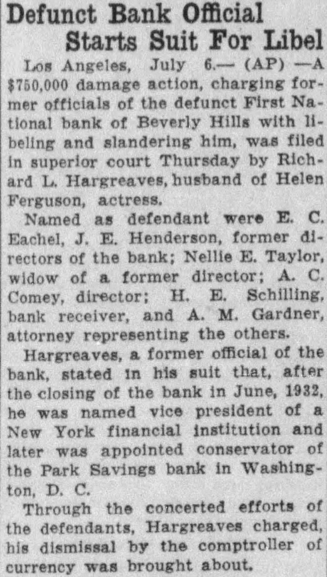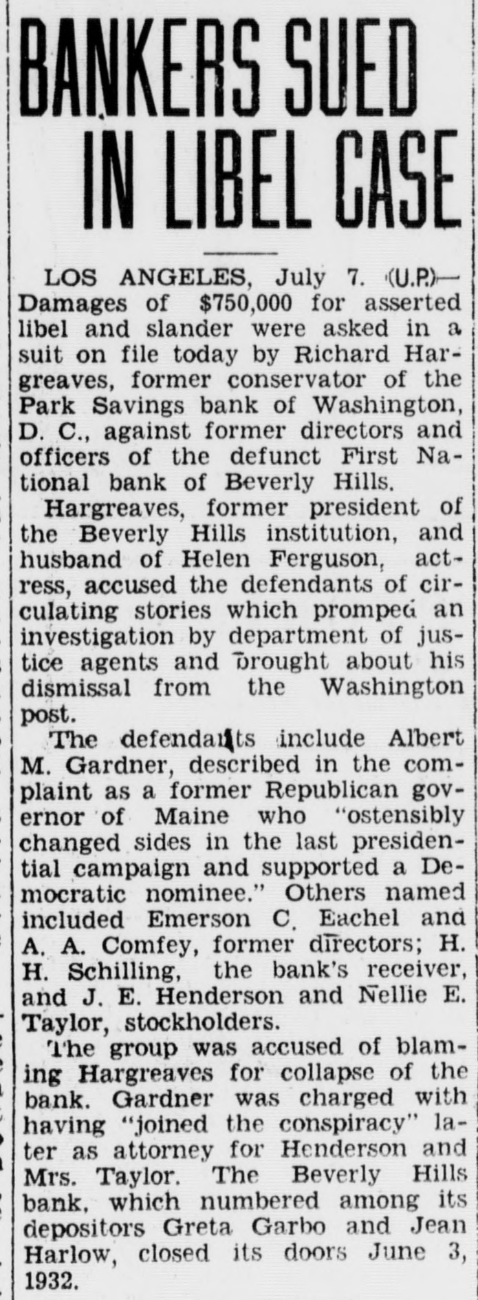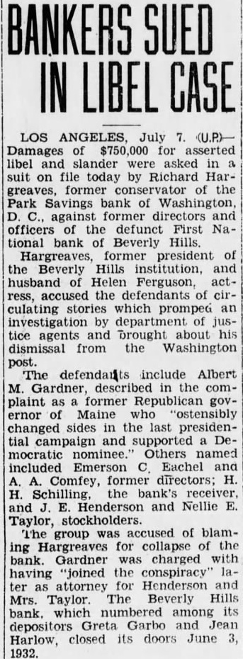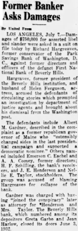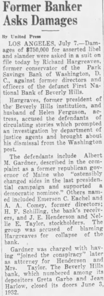Los Angeles, July ages of $750,000 for asserted libel and slander were asked in suit on file today by Richard Hargreaves, conservator of the Park Savformer ings Bank of Washington, against former directors and officers of the defunct First National Bank of Beverly Hills. Hargreaves, former president of the Beverly Hills institution and husband of Helen Ferguson, actress, accused the defendants of circulatstories which prompted an investigation by department of justice agents and brought about his dismissal from the Washington Post. Hargreaves first wife was Grace Fryan, daughter of William Jenmings Bryan, whose sister, Ruth Bryan Owen, ambassador to Denmark Before entering the banking business in Beverly Hills, he was national bank examiner. The defendants include Albert M. Gardner, described in the complaint former Republican governor of Maine who "ostensibly changed sides in the last presidential campaign and supported Democratic nomineee." Others named included Emerson Eachel and Comey, former Schilling the bank's receiver, and Henderson and Nellie E. Taylor, stockholders. The group was accused of blaming Hargreaves for collapse of the bank. Gardner was charged with having "joined the conspiracy" later attorney for Henderson and Mrs. The Beverly Hills bank closed its doors June 1932.