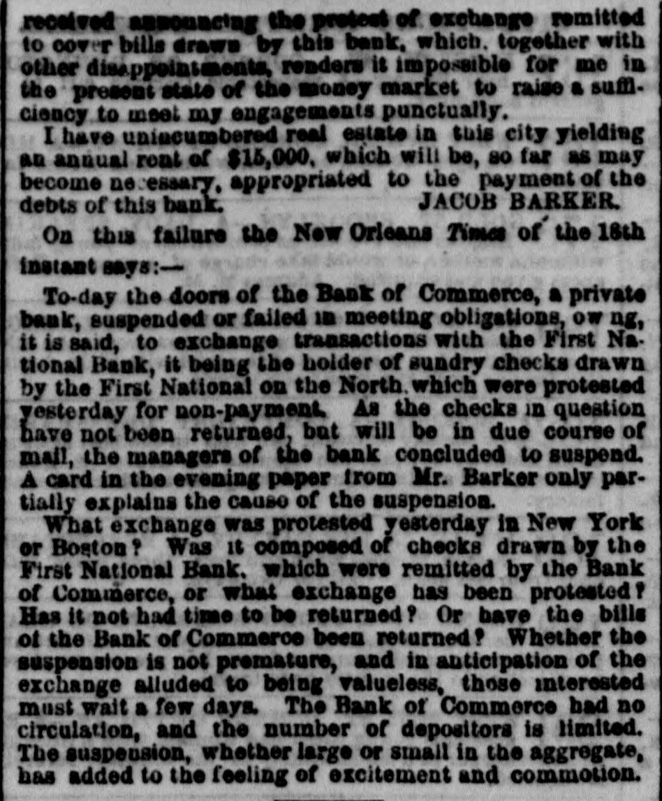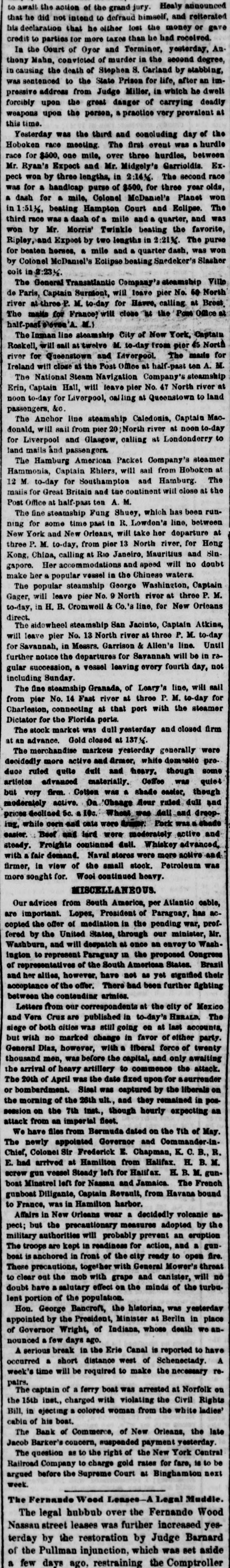 to await the action of the grand jury. Healy announced retterated pus 'Hosung on you PID on suip CARD JO Aenour our 1801 Joque eq "" and received peq on use) orom JOI partics or supero In the Court of Oyer and Terminer, yesterday, An'eerSep pueces eus " JO 'oqek Auout etable sq S wouders JO upon our Sujance at - use Jerse 'ejn JOJ SIATE our 04 procedues U.S.A. pressive address from Judge Miller, in which he dwelt Alpeep jo JOSuep Brown em uodn Jorobby 10 Provalest Area . 'uessed our uodn suodvem emily sith our jo Aup puv purch on SUM . SEM THOAO 18.1g OUL Superm 9000 race for $500, one mile, over three hurdles, between 15 8,4108pim - pus un DOWS puoces equ %ore " throe 4q UOM good 'spio read throo JOJ $5000 jo essnd . JOJ SUM UOM Plants Colonet miller . JOJ usep . OUL pus Court Holdway '%19:1 u) SUM pue quarter . pus = jo usep . BUM GOBS Paius won by Mr. Morris' Twinkle beating the favorite, end The 2:21% B) supplies OM3 4q 100dxy UOM SUM 'ysup refund . pus Injo . 'sesseq between JOJ by Colonel McDaniel's Eclipse beating Snedeker's Slasher $100 The General Transatlantic Company's steamship Ville de Paris, Captain Surment, will leave pier No. 60 North Broath 100 calling JOJ Aup-01 " JOAN to own and on 18, crop THE aoy appear OUR I'll The Inman line steamship City of New York, Captain North SP 2016 most sup-or " 18 1100 11145 Rosterl JOJ spear our pus unotsucend JOJ JOAN " "V wes 19vd-jjeq 18 "WO Post eys 10 cholo 1114A The National Steam Navigation Company's steamship Erin, Captain Hall, will leave pier No. 47 North river at I 03 10 Suijeo Transport JOJ Awp-01 uoou org The Anchor line steamship Caledonia, Captain MacAup-or uoou TO JOAN 20:N0 setd more 1198 IIIM *pisuop on 18 'MONSVID pus JOJ land mails and passengera. The Hamburg American Packet Company's steamer 18 нолодон most The IIIM Captain 12 M. to-day for Southampton and Hamburg. The eye TO 05010 111AM continue our puu Britely GROUP Joj mails Post Office at half-past ten A. M. -und useq lass 'Tenus Bung distribute eug our 'oull squepmont " u) wed child euros Joj Suiu New York and New Orleans, will take her departure at SucH 10J 'JOA(2 North 81 pier 'Rep-or W 'd Kong, China, calling at Rio Janeiro, Mauritius and Sinsquop ou 11144 peeds pus JOH Reduced make her a popular vessel in the Chinese waters. The popular steamship George Washington, Captain 'K 'd chroo 18 JOAL North 6 No. Jejd THAT Gaser OF MON JOJ 'ough 8,00 r Common 'H "H u: 'Aup-os direct. The sidowheel steamship San Jacinto, Captain Atkins, Avp-02 * 'd shree 18 JOAJJ North 13 No. pler ITIAN for Savannah, in Messrs. Garrison & Allen's line. Until further notice the departures for Savannah will be in ra100 'Asp Jourth ÁJOAO I LOSSOA . Juin8 including Sunday. 1100 THM "oull jo discurses eug The JOJ Aup-or и a 1hroo TO river 180.4 " No. ple more stormer on 4114 used legs TO connetting Charlester, Dictator for the Florida ports. may pesolo pus UPP SUM market ROOD The %181 TO PIOD ******** av 18 The merchandise markets yesterday generally were -o.rd THE pus extire aroun Applicant euros unous 'LAVOY pus Hap and conp articles advanced materially. Ceffee was quiet 42neq: Jejese opens . SUM Code u.sg AJGA 10q put HPP popus moy TO Medical -doosp pas now - '001 . og period secred opens . SUM Per - arem pro used "Sur pus allow DJOM pust you Joeg Jojes steady. Freights continued dull. Whiskey advanced, per ejotts 0.10 AM 20J018 IVAN puvemop Hej . que U.S.A. Perioded stools Illume our jo MOJA up 'Jewing . Avoy penumos ЮОМ 'J0J 14800s e.com SAOHNVTIEOSIE Our advices from South America, per Atlantic cable, -ow seq jo Prosiders 'sedo'I ere -josd 'JUA Suppued om a 10 Jego our code "IN ano 4200.143 our 4q peroj of LOAND us eouo TO understand 1114 pus perdoad on - sepresent 07 American usnog our jo JO should pegrusts 106 " sou GAVY and Joy pus Journj useq puq There our jo cousideoos between the contending armies. ****** jo and our 10 ano moy I and Vera Cruz are published in to-day's HERALD. The 'sjunecos [w] = do Sujos me SEM quot jo 02018 effile 10 JOANJ u) e.Buvqo marked ou UTIM mq jo Coroj . THE "IN General Suppleme Ajuo pus our a STAM 'nour pursnoqs the arrival of heavy artillery to commence the attack. 203 uodn pexy essp eqs SUM jo 2005 The or bombardment. Sisal was captured by the liberals on -sod ay Lougs pus "In 2914 our jo Sujurous eqs - Suppoedre hours UNneqs 412 eqs uo understand attack from an imporial fleet. Aun jo 411 our no persp mosj sein GAWY OM The newly appointed Governor and Commander-inChief, Colonel Sir Frederick E. Chapman, K. C. B., R. R a H mosy Helliton see peq a -uns R H H 203 1101 Speets uns MOJOS boat Minstrel left for Nassau and Jamaica. The French gunboat Diligante, Captain Revault, from Havana bound to France, was in Hamilton harbor. Affairs in New Orleans wear a decidedly volcanic asour 4q pendops services equal snq :sood us probably IIIM authorities American un8 . pas action JOJ receipts an Idex are sdoors our esg uedo of Apeer AND equip jo quosj up a #) reoq These precautions, together with General Mower's threat ou 111AM pus a THE qour our 100 cheque 03 -nq.ns our jo spujes our NO гоеде subjury . DATE squop lent portion of the population. Hon. George Bancroft, the historian, was yesterday us Berlin 10 our 4q applicate -us OM used esoqa Indiana jo 'squire Governor jo *** saep MOJ . peounou DAVY 01 reported 81 Canal our up break shopting V V jo 150 AM district Lous . ocourred -0J eq: exem 01 required eq IIIM earn 9,300M suped The captain of a ferry boat was arrested at Norfolk on RIghts HAID our THE charge 1001 1544 our [seiper 0114 em mosy имом 001020 . Sunsefe us THE cabin of his boat. The Bank of Commerce, of New Orleans, the late Jacob Barker's concern, suspended payment yesterday. Contral Tort MEN em jo 19211 our 03 se The eq 08 # 'erej JOJ selve P108 charge 01 Company Relition 1xeu TO Court guardians our 0.10jeq pensue reem The Fernando Wood Leases-A Legal Muddle. The legal hubbub over the Fernando Wood Nassau street leases was furt