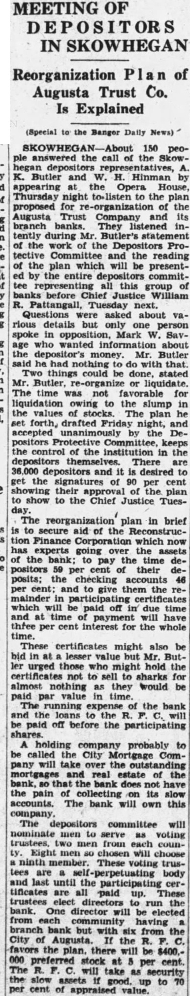 (Continued from Page One.) rate this company would make about $700,000.00 year. looks as though normal times this company would gilt edge investment. Since the above were acquired the New England there has been paid out by them labor salaries total of about $29,000,000.00. In the week ending July 29th, 1933 five cotton mills employed persons paid out $93,178.17 1932 they employed 2,238 persons and paid out That increase 3,951 persons and week ending July 29, 1933 the Maine Seaboard Paper Co., paid and employed persons; Crosset Shoe Co., paid out employed 96 persons; the Keyes Fibre and employed persons; the Maine Steel Products Co., and employed sons. Apart from these companies the Central Maine Power employes about 700 persons and the annual The Bath Iron Works on account its being in my and ing morally and financially interested its account owning lot of real estate in this course the success of the Bath Works makes my property good deal more valuable affects every other loproperty owner in the way, And then again went down the old Goss Marine Iron Works the Gen. Hyde when abandoned plant him his son, John, building ways, wharves, chine shops until was one of the equipped plants the country. Taking all these circumstances together readily appreclate grateful to Mr. Wyman, as the New England Public Service came here bought when was being junked, and great deal had already taken out the plant when they took The plant had gone into receiver's hands and so far able to certain was the largest individual bondholder when it went into receivership and took my licking gracefully together small of the investment. felt worse about plant being junked than about the my Mr. Wyman, not being shipbuilder, bought this sold it to Mr. Newell very not only that, but assisted Mr. Newell in establishing line of credit through the delity Trust Co., without which would have been unable to give bonds ships and obtained material and labor after the Now this Bath Works, with its $7,000,000 able to along without having made good ord increased the the plant, and through successful erations the others who are able and to come with them and participate in the and the they obtain. Mr. Newell and his associates are the owners, control plant, but had not been for the helping of Walin its hour of need, this plant would entirely on the this time. With most of these numerous other plants have cited to, headthe same way, that say people in the immediate these plants should be grateful preciate Mr. Wyman's efforts their behalf, and coming to the these great 8006 people, exclusive of the Central Maine Power Co., and paying out weekly or $5,707,484.64 annually and these figures are likely to show marked This certainly wonderful right the midst the world wide the citizens of Maine should each and every one proud and the efforts this wonderful and man who has done very much for them. These plans that have cited you above, not the main industry which Mr. Wyman has been building The Central Maine Power Co. has been his special for many years. He has made every effort to develop this company and Maine's resources. This great company has functioned through pression, done what many other companies have been unable paid its preferred stock holders full, and now well on the road to better times, having its output the ratio 1,000,000 kilowatts 700,000. The Central Maine Power employs about 700 persons its annual payroll $1,020,000. This, aside from many construction jobs that not come under the regular payroll. Also, has have amount which employment great other The statewide criticism of Mr. Wyman account of the banksituation the Fidelity Trust Co., Portland, Maine, and the Augusta Trust Augusta, All kinds of charges have been made, all the way from the deto spending to enrich and his As near as have been able to ascertain the facts, the following the situation. During the depression active banks as well as individuals and other business have suffered. near could learn from men who ought to be able to judge, banks are going pay about 85 per more to the positors. After paying the large and unnecessary cost of as say to the things indicate that in this wrecking job they are faring than other parties involved but am quite certain that this wrecking job was unmost any other individual had our securities and real before the the money in either of trust and got 85 we per should great deal better off than we are going to give you illustration of what happened The depression certainly misleading. its course had periods way down when the ablest men, including President Hoover, declared the was over. In one of these periods good Public Utilities stock called North American, which had paid over 100 continuous stock dividends, which took them over period of years, went down to $100 per share and one of the most bankers know bought did not owe nickat that time had around 3,000 shares of good stock of various kinds. have made practice through life, which may be good or bad, of buying hiring the and pay. for them earned already 300 shares of North American, when got down $87 and bankers were buying thought would buy three hundred shares hired it. This North American stock kept going down until reached $15, or about 1-6 what paid for when bankers the depression was over. had had liquidate at this time and pay, would have been lasting dent in life's earnings. Banks cannot take the depositors money and lock up strong box and keep there, then pay dividends the depositors. They have loan and for collateral some such have cited above. This stock selling around and the present time 31 bringing per cent on citing this show you that instead buying that time, even sold the 300 shares North American that then had at share put ceeds in the Augusta Trust Co. or the Fidelity Trust Co. on deposit, would be paid about per cent. wish the attention some of the depositors to the fact that liquidate this stock today would get about per cent what would have had sold depo