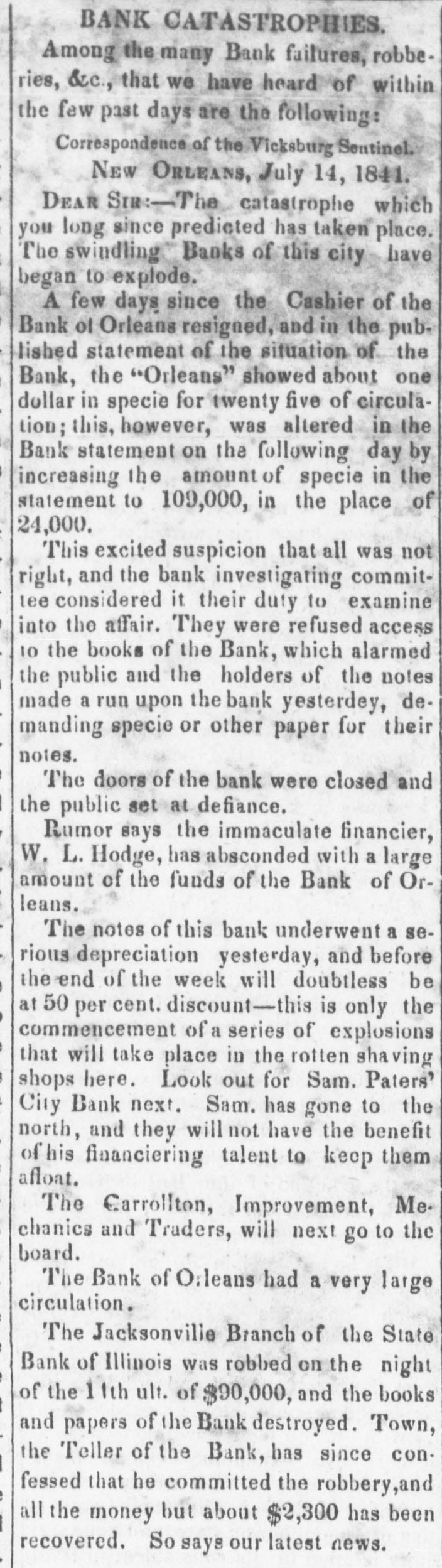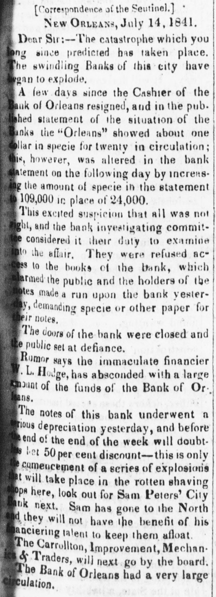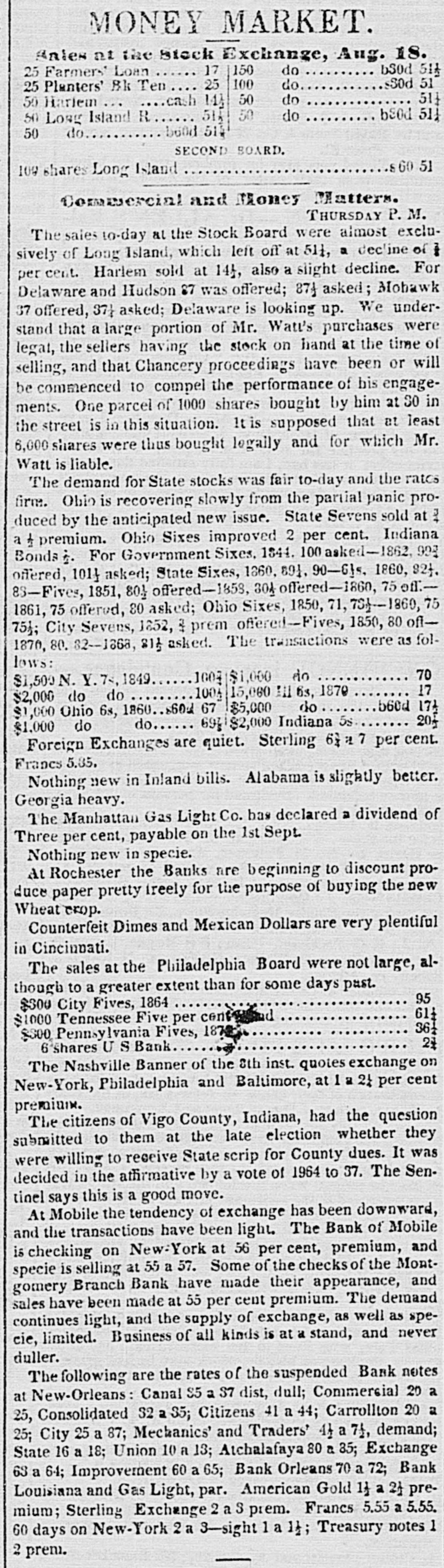 Specie continues to accumulate, and we notice no change in rates. The only demand is for New-Orleans. One of our Banks shipped $10,000 a few days since, and private houses are sending considerable amounts. We quote American Gold, old 6 prem Spanish Dollars 3 a it prem Carolus Dollars 3 a 6 prem Mexican Dollars : 5 prem Five Franc Pieces 93 a 94 cents Doubloons $16.00 a 16 25 Doubloons, Patriot 15.60 a 15.65 4 84 a 4 86 Sovereigns 4 83 a 4 85 Light Sovereigns 5-a 5 05 Heavy Guineas A heavy Sovereig weighs 5 dwt gr. There is an abundant supply of Treasury Notes at par and 1 discount. A letter from Amsterdam, of 28th June, published in Le Commerce of the 7th inst. says Great sensation has been excited on Change to-day by a notice given by the house of Hope & Co., which announces that the coupons of the American stock which be. come due on the 1st of July will not be paid. because the house has received nothing to make this payment. On this point there is not much 10 say, because it was foreseen that the funds for payment of the coupons would not arrive. But what is openly blamed. and will probably be the founda. tiou of an action against Hope & Co is, that their bankers having been furnished by the Bank of the United States with a quantity of effects (valeurs) as security for the tenders, have thought themselves authorised to part with a portion of these securities in exchange for others. As chance would have it. though the nominal value has remained the same, it turns out that Messrs. Hope & Co. have parted with the most valuable, in exchange for such as have hardly any value at all. We need not say that the holders are furious. The Tolls ON the Canals of this State received to the 22d $711,334 inst. amount to 847,392 Same time 1841 $136,058 Difference in favor of 1341 The Newark City Council having passed a Resolution that the Morris Canal Co. be required to repair the bridges over the Canal, or upon failure the Street Commissioners be authorized to fill it up ot those points, a correspondent of the Newark Advertiser enters his protest and says that there are no funds with which to make these repairs; that the property is in the hands of Receivers for the purpose of liquidation, and that the Canal which the Council thus prepose to destroy is the only property left to pay the creditof the concern, whose claims amount to $9,000,000, in the following order of title $850,000 Due to the Dutch 2,000,000 State of Indiana about 800,000 State of Michigan about 1,300,000 British bond-holders about 4.600.00 Stock-holders $7,950,000 Total besides numerous domestic creditors. The correspondent calculates that the Newarkers would by such a course not only commit a gross imposition open the creditors, but also bite off their own noses. The gross receipts on the Eastern Railroad from 1st Jan. $116,498 to 30th June were 116,947 Same time 1841 The road from Boston to the Partsmouth deput has cost $2,734,693. The precise operation of banking in Cincinnati from April to Jane is thus stated Means paid out. Means reduced $161,951 Discounts For Depos. reduced $34,648 16,190 14,284 Bk. Balances paid Bank Notes 661 Circulation increased. 28,367 Bank Credits $79,205 Total Total Reduction 189,327 It will be seen that in the last two months, there has been a continual reduction of the business of the Cincinnati Banks, and in fact, it now is merely nominal. The $.8.367 increased circulation is the difference between the increased circulation of the Life and Trust Company, and the diminished circulation of the other Banks. None of the Life and Trust notes are seen in circulation there. 327,593 The amount of circulation in the aggregate is 943,000 Deposits 233,900 Specie 392,494 Bank Notes 3024,220 Discount The largest circulation in the State is the Bank of Wooster, $200,278, the largest amount of specie, the Bank of Norwich. $131,366. Exchanges at Mobile have been getting worse daily.Sight checks on New York, and specie, have gradually advanced from 45 per cent (the rates last quoted) to 58 a 60 per cent premium. Checks on New York at five days sight have been sold at 56, and sight checks for small amounts have commanded as high as 60 per cent prem. There are butfew drawers, and transactions are very limited. The demand for speeie for the New Orleans trade has not diminished. It has been sold as high as 62, though the current rate is 60. Sight checks on New York 55 a 58 per cent prem; and specie 58 a 62, and scarce. Under the head of Astounding Developements" the Augusta Chronicle says that a rumor is current that a system of fraud on the part of some of the Darien fianciers, in connection with the Bank of Darien, will be soon disclosed which will far exceed in extent and enormity any thing of the kind that has transpired in Georgia. The Bank of Orleans at New Orleans, has gone into active liquidation under W. C.C. Claiborne, M. Caruthers and J. B. Hullen. Rumors were afleat than an affair of honor was about to com off between two bank Presidents.