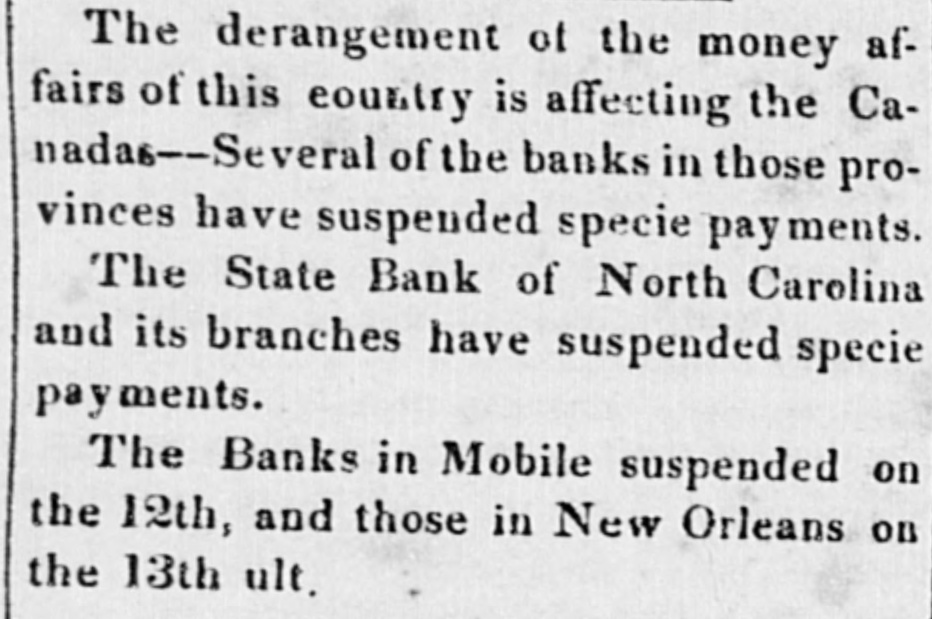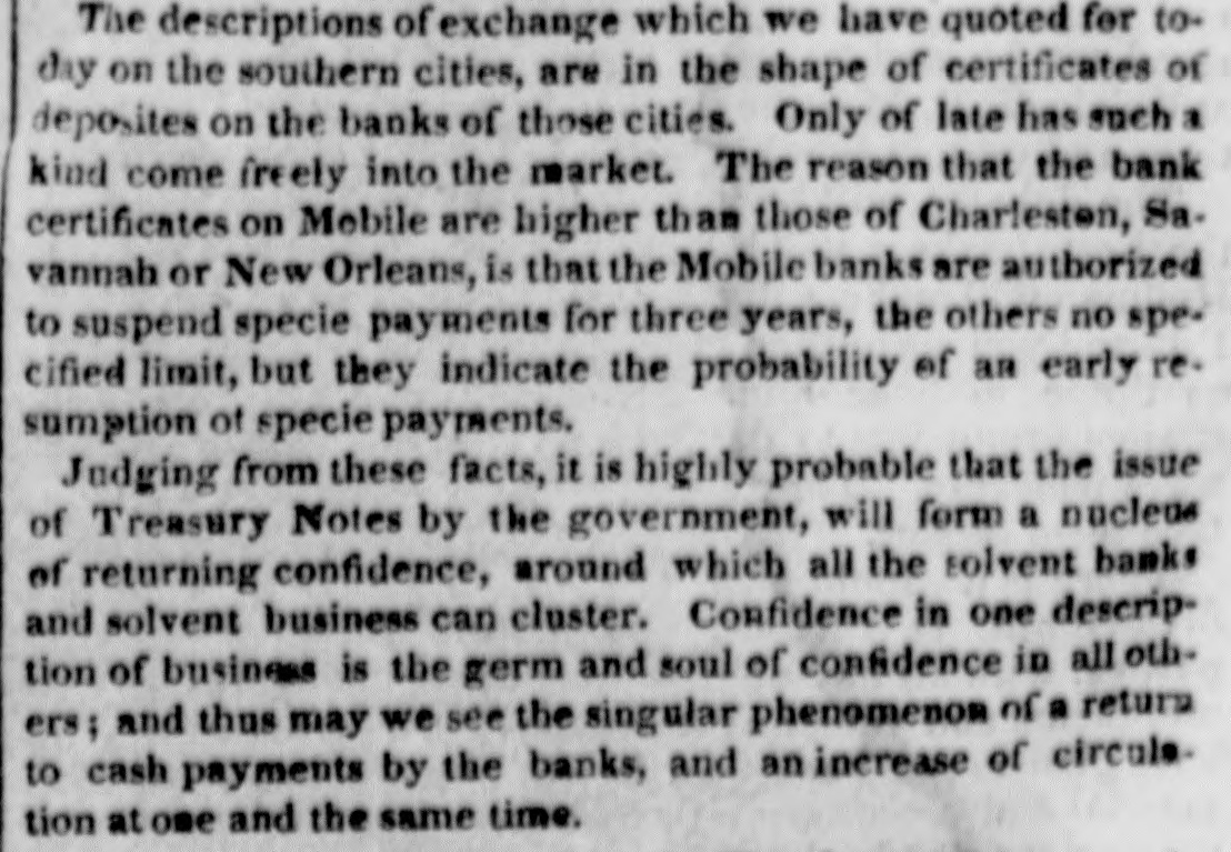 The descriptions of exchange which we have quoted for today on the southern cities, are in the shape of certificates of deposites on the banks of those cities. Only of late has such a kind come freely into the market. The reason that the bank certificates on Mobile are higher than those of Charleston, Savannah or New Orleans, is that the Mobile banks are authorized to suspend specie payments for three years, the others no specified limit, but they indicate the probability of an early resumption of specie payments.