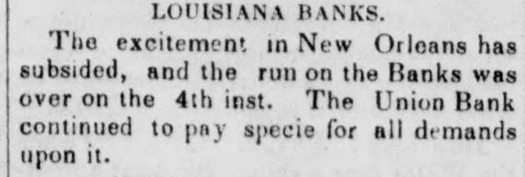 LOUISIANA BANKS. The excitement in New Orleans has subsided, and the run on the Banks was over on the 4th inst. The Union Bank continued to pay specie for all demands upon it.