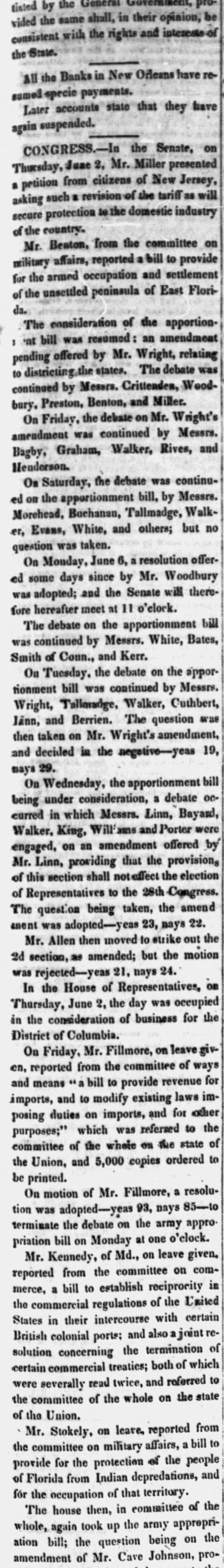 tisted by the General Government, provided the same shall, in their opinion, be consistent with the rights and interests the State. All the Banks in New Orleans have resumel specia payments. Later accounts state that they have again suspended. CONGRESS.-In the Senate, on Thursday,June 2, Mr. Miller presented 2 as will asking a petition such from revision citizens of of the New tariff Jersey, secure protection to the domestic industry of the country. Mr. Benton, from the committee on military affairs, reported a bill to provide for the armed occupation and settlement of the unsettled peninsula of East Florida. The consideration of the apportion, nt bill was resumed: an amendment pending offered by Mr. Wright, relating to districting the states. The debate was continued by Messrs. Crittenden, Woodbury. Preston, Benton, and Miller. On Friday, the debate on Mr. Wright's amendment was continued by Messrs. Bagby, Graham, Walker, Rives, and Henderson. On Saturday, the debate was continued on the apportionment bill, by Messrs. Morehead, Buchanan, Tallmadge, Walker, Evans, White, and others; but no question was taken. On Monday, June 6, a resolution offered some days since by Mr. Woodbury was adopted; and the Senate will therefore hereafter meet at 11 o'elock. The debate on the apportionment bill was continued by Messrs. White, Bates, Smith of Conn., and Kerr. On Tuesday. the debate on the apportionment bill was continued by Messrs. Wright, Tallaradge, Walker, Cuthbert, lann, and Berrien. The question was then taken on Mr. Wright's amendment, and decided in the negative-yeas 19, mays 29. On Wednesday, the apportionment bill being under consideration, a debate occurred in which Messrs. Linn, Bayard, Walker, King, Williams and Porter were engaged, on an amendment offered by Mr. Linn, providing that the provisions of this section shall noteffect the election of Representatives to the 28th Congress. The question being taken, the amend ement was adopted-yeas 23, nays 22. Mr. Allen then moved to strike out the 2d section, as amended; but the motion was rejected-yeas 21, nays 24. In the House of Representatives, OR Thursday, June 2, the day was occupied in the consideration of business for the District of Columbia. On Friday, Mr. Fillmore, on leave given, from the ways reported committee of and means " a bill to provide revenue for imports, and to modify existing laws imposing duties on imports, and for other which was to purposes;" refersed the committee of the whole ON the state of the Union, and 5,000 copies ordered to be printed. On motion of Mr. Fillmore, a resolution was adopted-yeas 93, nays 85-to terminate the debate on the army appropriation bill on Monday at one o'clock. of Md., on Mr. Kennedy, leave given. reported from the committee on commerce, a bill to establish reciprocity in the commercial regulations of the United States in their intercourse with certain British colonial ports: and also joint resolution concerning the termination of certain commercial treaties; both of which were severally read twice, and referred to the committee of the whole on the state of the Union. Mr. Stokely, on leave, reported from the committee on military a to affairs, the people bill for the protection of from Indian and provide of Florida depredations, for the of that then, in committee the The occupation house territory. of whole, again took up the army apprepriation bill; the question being on the amendment of Mr. Cave Johnson, pro-