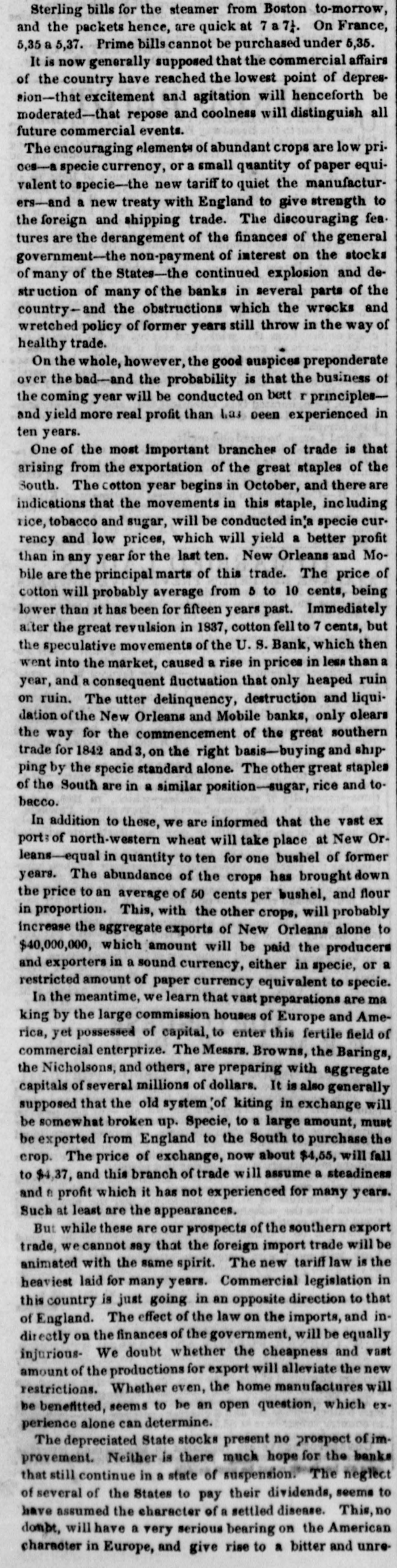 Sterling bills for the steamer from Boston to-morrow, and the packets hence, are quick at 7 a 7¼. On France, 5,35 a 5,37. Prime bills cannot be purchased under 5,35. It is now generally supposed that the commercial affairs of the country have reached the lowest point of depression—that excitement and agitation will henceforth be moderated—that repose and coolness will distinguish all future commercial events. The encouraging elements of abundant crops are low prices—a specie currency, or a small quantity of paper equivalent to specie—the new tariff to quiet the manufacturers and a new treaty with England to give strength to the foreign and shipping trade. The discouraging features are the derangement of the finances of the general government—the non-payment of interest on the stocks of many of the States—the continued explosion and destruction of many of the banks in several parts of the country—and the obstructions which the wrecks and wretched policy of former years still throw in the way of healthy trade. On the whole, however, the good auspices preponderate over the bad—and the probability is that the business of the coming year will be conducted on better principles—and yield more real profit than has been experienced in ten years. One of the most important branches of trade is that arising from the exportation of the great staples of the South. The cotton year begins in October, and there are indications that the movements in this staple, including rice, tobacco and sugar, will be conducted in'a specie currency and low prices, which will yield a better profit than in any year for the last ten. New Orleans and Mobile are the principal marts of this trade. The price of cotton will probably average from 5 to 10 cents, being lower than it has been for fifteen years past. Immediately after the great revulsion in 1837, cotton fell to 7 cents, but the speculative movements of the U. S. Bank, which then went into the market, caused a rise in prices in less than a year, and a consequent fluctuation that only heaped ruin on ruin. The utter delinquency, destruction and liquidation of the New Orleans and Mobile banks, only clears the way for the commencement of the great southern trade for 1842 and 3, on the right basis—buying and shipping by the specie standard alone. The other great staples of the South are in a similar position—sugar, rice and tobacco. In addition to these, we are informed that the vast exports of north-western wheat will take place at New Orleans—equal in quantity to ten for one bushel of former years. The abundance of the crops has brought down the price to an average of 50 cents per bushel, and flour in proportion. This, with the other crops, will probably increase the aggregate exports of New Orleans alone to $40,000,000, which amount will be paid the producers and exporters in a sound currency, either in specie, or a restricted amount of paper currency equivalent to specie. In the meantime, we learn that vast preparations are making by the large commission houses of Europe and America, yet possessed of capital, to enter this fertile field of commercial enterprize. The Messrs. Browns, the Barings, the Nicholsons, and others, are preparing with aggregate capitals of several millions of dollars. It is also generally supposed that the old system of kiting in exchange will be somewhat broken up. Specie, to a large amount, must be exported from England to the South to purchase the crop. The price of exchange, now about $4,55, will fall to $4,37, and this branch of trade will assume a steadiness and a profit which it has not experienced for many years. Such at least are the appearances. But while these are our prospects of the southern export trade, we cannot say that the foreign import trade will be animated with the same spirit. The new tariff law is the heaviest laid for many years. Commercial legislation in this country is just going in an opposite direction to that of England. The effect of the law on the imports, and indirectly on the finances of the government, will be equally injurious. We doubt whether the cheapness and vast amount of the productions for export will alleviate the new restrictions. Whether even, the home manufactures will be benefitted, seems to be an open question, which experience alone can determine. The depreciated State stocks present no prospect of improvement. Neither is there much hope for the banks that still continue in a state of suspension. The neglect of several of the States to pay their dividends, seems to have assumed the character of a settled disease. This, no doubt, will have a very serious bearing on the American character in Europe, and give rise to a bitter and unre-