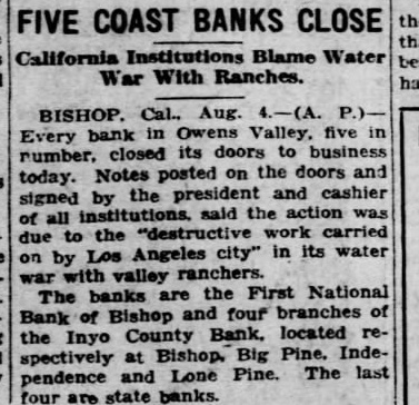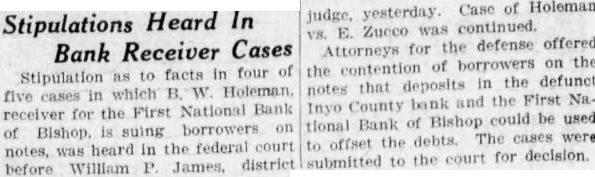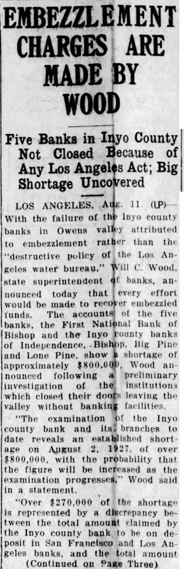 FURTHER DISASTER IMPENDING Owens Valley Bank Crash May Result in Other Collapses. TO START PROBE Government Names Holeman Receiver for Financial Institutions. BISHOP, Calif., Aug. 15.-The specter of further financial disaster hovered over Owens Valley today with the announcement by the state corporation department that an investigation would be launched into all enterprises operated by W. W. and Mark Watterson, bankers. The Watterson brothers, who controlled the five Inyo county banks, which recently closed their doors, operate the Watterson Brothers, Inc., a holding company; Natural Soda Products Company, The Eaton Land and Cattle Company, the Tungsten Products Company and the Coso Hot Springs Company. Books and records of all except the Coso company have been seized and are in the custody of Arthur E. Johnson, department auditor. The investigation, entirely separate from the bank probe, is to determine whether the Wattersons have violated the corporate securities act by issuing stock contrary to their permits. Johnson is expected to make , report on the $1,000,000 holding company under which the brothers operated a garage, hardware and general store and sold stock in them. C. H. McLean, federal examiner, has completed his investigation of the First National Bank here an will forward his report to Washington. C. H. Lowell, state bank ex. aminer has taken charge of the Inya County Bank here and its branches at Big Pine, Independence and Lone Pine. The brothers have refused to make a statement following the charges of Will C. Wood, state superintendent of banks, that $800,00 had been embezzled, other than to lay their financial condition to the valley's water war with the city of Los Angeles. The Williams Market, largest in the county, closed its doors Satur dav night. and it is fearnd that other business houses will follow the same course. WASHINGTON, Aug. 15.-Appointment of B. W. Holeman, Invo county, California, as receiver for the First National Bank. Bishop, Calif., a state bank with four branches in the county, all of which closed recently was announced at the office of the comptroller of the currency today. The appointment was forwarded through the San Francisco office of the comptroller, and Holeman probably will report there.