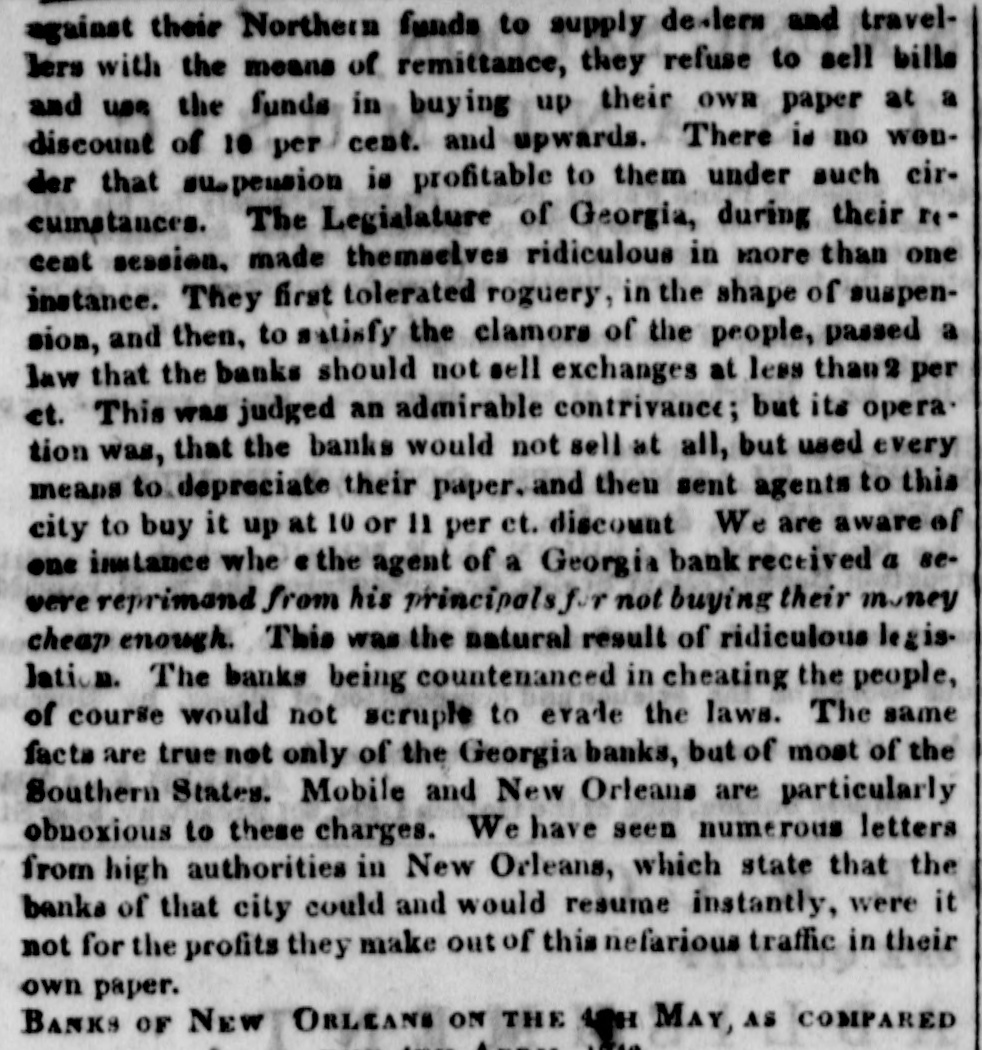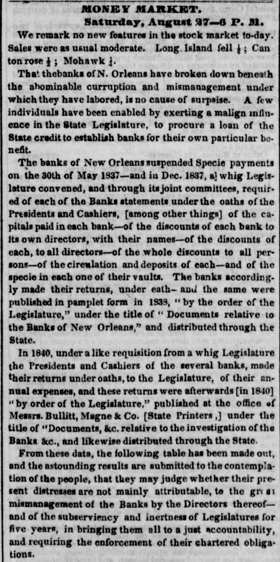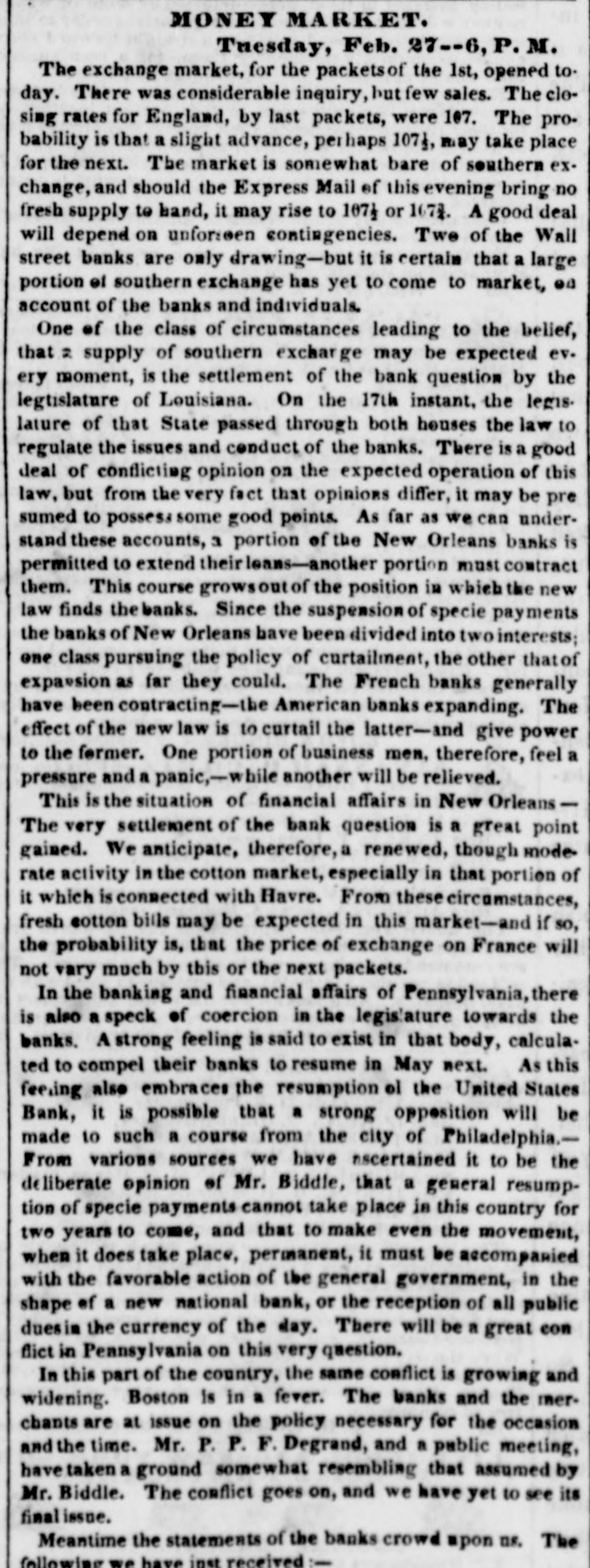 MONEY MARKET. Tuesday, Feb. 27--6,1 P. M. The exchange market, for the packets of the 1st, opened today. There was considerable inquiry, but few sales. The closing rates for England, by last packets, were 107. The probability is that a slight advance, perhaps 107₫, may take place for the next. The market is somewhat bare of southern exchange, and should the Express Mail of this evening bring no fresh supply to band, it may rise to 1071 or 1673. A good deal will depend on unforment contingencies. Two of the Wall street banks are only drawing-but it is certain that a large portion et southern exchange has yet to come to market, 04 account of the banks and individuals. One of the class of circumstances leading to the belief, that 2 supply of southern excharge may be expected ev. ery moment, is the settlement of the bank question by the legtislature of Louisiana. On the 17th instant, the legis. lature of that State passed through both houses the law to regulate the issues and conduct of the banks. There is a good deal of conflicting opinion on the expected operation of this law, but from the very fact that opinions differ, it may be pre sumed to possess some good points. As far as we can understand these accounts, a portion of the New Orleans banks is permitted to extend their leams-another portion must contract them. This course growsout of the position in which the new law finds the banks. Since the suspension of specie payments the banks of New Orleans have been divided into two interests; one class pursuing the policy of curtailment, the other that of expassion as far they could. The French banks generally have been contracting-the American banks expanding. The effect of the new law is to curtail the latter-and give power to the former. One portion of business men, therefore, feel a pressure and a panic,-whil another will be relieved. This is the situation of financial affairs in New Orleans The very settlement of the bank question is a great point gained. We anticipate, therefore, a renewed, though mode rate activity in the cotton market, especially in that portion of it which is connected with Havre. From these circumstances, fresh cotton bills may be expected in this market-and if so, the probability is, that the price of exchange on France will not vary much by this or the next packets. In the banking and financial affairs of Pennsylvania, there is also a speck of coercion in the legislature towards the banks. Astrong feeling is said to exist in that body, calculated to compel their banks to resume in May next. As this feeling also embraces the resumption el the United States Bank, it is possible that a strong opposition will be made to such a course from the city of Philadelphia.From varions sources we have nscertained it to be the deliberate opinion of Mr. Biddle, that a general resumption of specie payments cannot take place in this country for two years to come, and that to make even the movement, when it does take place, permanent, it must be accompanied with the favorable action of the general government, in the shape of a new national bank, or the reception of all public duesia the currency of the day. There will be a great con flict in Pennsylvania on this very question. In this part of the country, the same conflict is growing and widening. Boston is in a fever. The banks and the merchants are at issue on the policy necessary for the occasion and the time. Mr. P. P. F. Degrand, and a public meeting, have taken a ground somewhat resembling that assumed by Mr. Biddle. The conflict goes on, and we have yet to see its final issue. Meantime the statements of the banks crowd upon us. The following we have inst received -