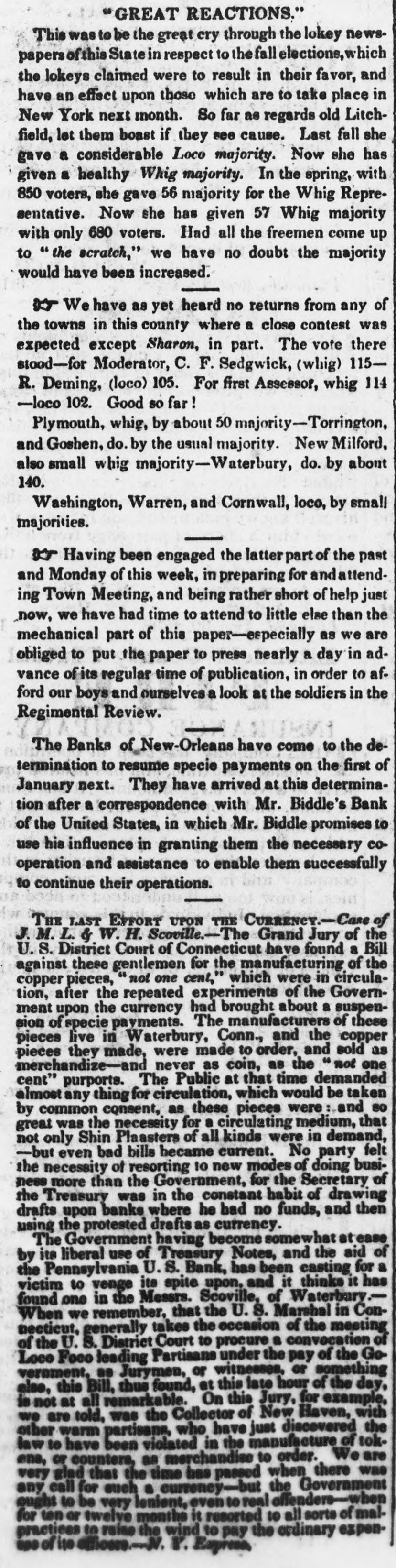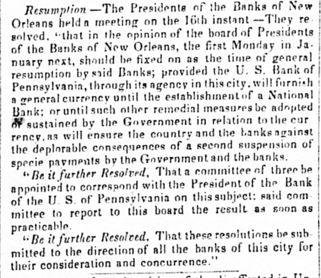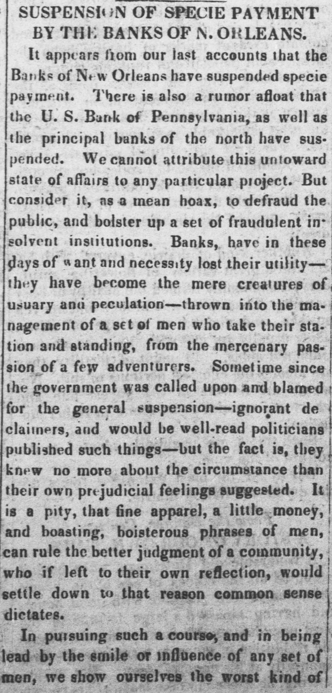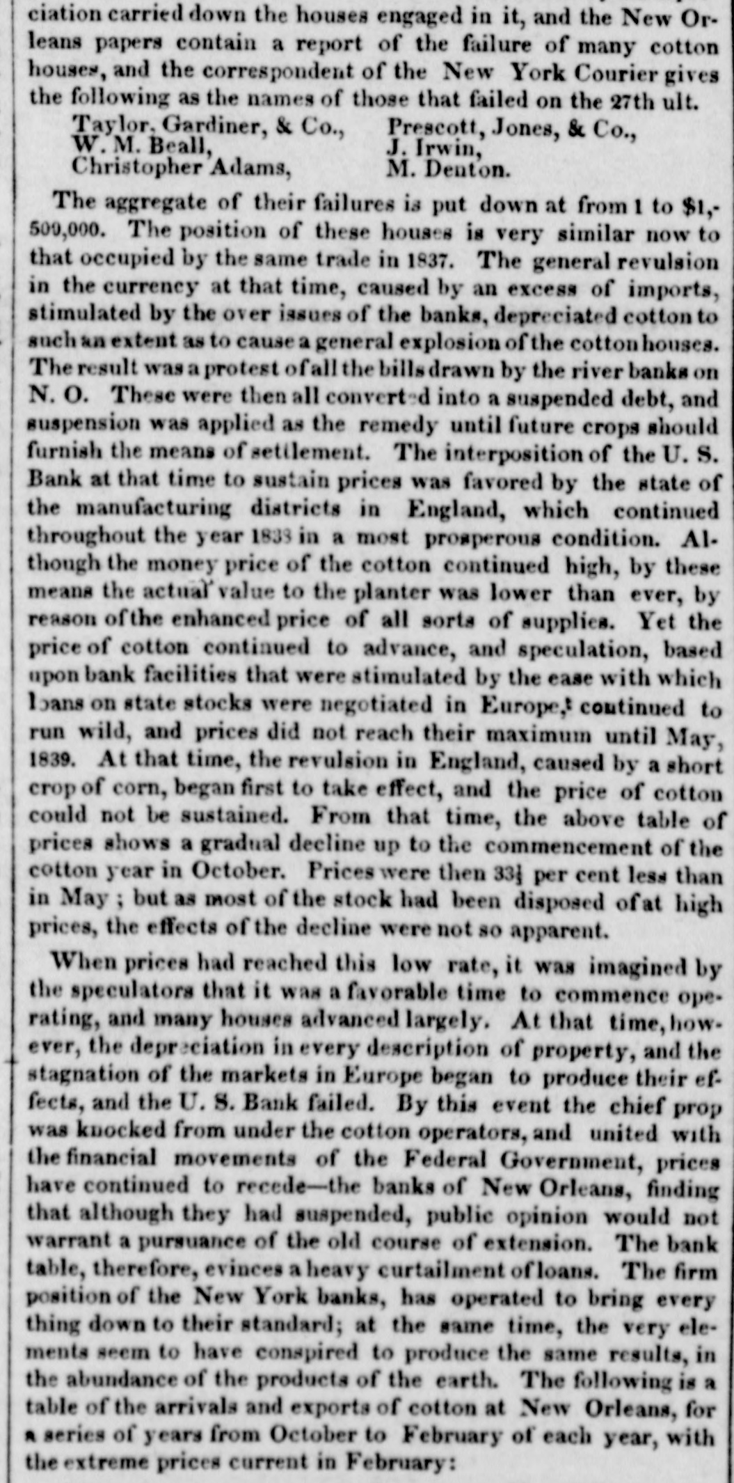 MONEY MARKET. Tuesday, Feb. 27--6,1 P. M. The exchange market, for the packets of the 1st, opened today. There was considerable inquiry, but few sales. The closing rates for England, by last packets, were 107. The probability is that a slight advance, perhaps 107₫, may take place for the next. The market is somewhat bare of southern exchange, and should the Express Mail of this evening bring no fresh supply to band, it may rise to 1071 or 1673. A good deal will depend on unforment contingencies. Two of the Wall street banks are only drawing-but it is certain that a large portion et southern exchange has yet to come to market, 04 account of the banks and individuals. One of the class of circumstances leading to the belief, that 2 supply of southern excharge may be expected ev. ery moment, is the settlement of the bank question by the legtislature of Louisiana. On the 17th instant, the legis. lature of that State passed through both houses the law to regulate the issues and conduct of the banks. There is a good deal of conflicting opinion on the expected operation of this law, but from the very fact that opinions differ, it may be pre sumed to possess some good points. As far as we can understand these accounts, a portion of the New Orleans banks is permitted to extend their leams-another portion must contract them. This course growsout of the position in which the new law finds the banks. Since the suspension of specie payments the banks of New Orleans have been divided into two interests; one class pursuing the policy of curtailment, the other that of expassion as far they could. The French banks generally have been contracting-the American banks expanding. The effect of the new law is to curtail the latter-and give power to the former. One portion of business men, therefore, feel a pressure and a panic,-whil another will be relieved. This is the situation of financial affairs in New Orleans The very settlement of the bank question is a great point gained. We anticipate, therefore, a renewed, though mode rate activity in the cotton market, especially in that portion of it which is connected with Havre. From these circumstances, fresh cotton bills may be expected in this market-and if so, the probability is, that the price of exchange on France will not vary much by this or the next packets. In the banking and financial affairs of Pennsylvania, there is also a speck of coercion in the legislature towards the banks. Astrong feeling is said to exist in that body, calculated to compel their banks to resume in May next. As this feeling also embraces the resumption el the United States Bank, it is possible that a strong opposition will be made to such a course from the city of Philadelphia.From varions sources we have nscertained it to be the deliberate opinion of Mr. Biddle, that a general resumption of specie payments cannot take place in this country for two years to come, and that to make even the movement, when it does take place, permanent, it must be accompanied with the favorable action of the general government, in the shape of a new national bank, or the reception of all public duesia the currency of the day. There will be a great con flict in Pennsylvania on this very question. In this part of the country, the same conflict is growing and widening. Boston is in a fever. The banks and the merchants are at issue on the policy necessary for the occasion and the time. Mr. P. P. F. Degrand, and a public meeting, have taken a ground somewhat resembling that assumed by Mr. Biddle. The conflict goes on, and we have yet to see its final issue. Meantime the statements of the banks crowd upon us. The following we have inst received -