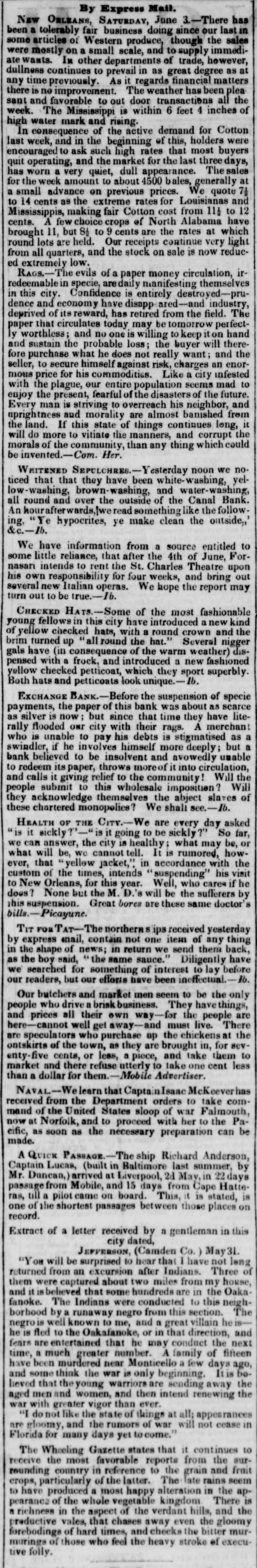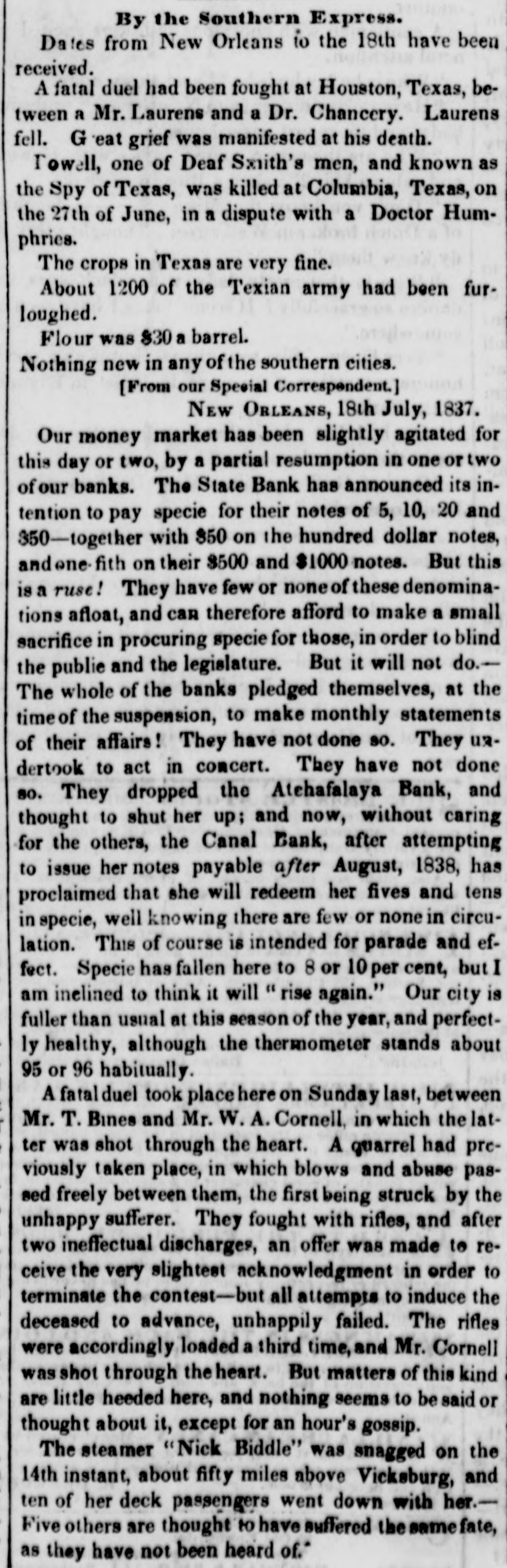 By the Southern Express. We have dates New Orleans August 15th, Augusta 18th. Charleston 18th, Mobile 16th, Tennessee CANAL BANK.-I gives us great has reaumour readers that the Canal to to in specie of her notes. the ad18th, THE inform the payment institutions Bank We hope satisfaction see ed followed by the other as to of whose affairs have ministration the example been public such credit so, as individual and demanda this at their hands. the of doubtful policy and our has developed its pernicious under of the present imperiously sion ginning, permit of their specie suffering doing epayment its crueleffects. influence, from The Withouten- suspeninto a discussion of the contradiction citizens are bankingsystem, tering without defects fear of banks, weassert have injured of the the essays public opinion, than all of more in the, fruitful discussion existence been the theme. With of the counthem their that theimpolitieproceeding opponents during their credit own which with the natural to expect that try be have abandoned jeopardized, they have prostrated, it was industry and this mea- they even have come either to the affairs, and sure, and basis, or of winding up went. by ing creditors as far as is not just, that the would, paying their the specie before this, their resolution their means of restor- whole intertheir property. It subserve the should besacrificed to have a few persons, who have no gets of comparatively community the sale of who been their own misfortunes, and assistance. claim the cause to our of sympathy, much less to our -Bee. The editors had been much edified by seeing the Indians at Pass Christian play ball. Tuscanutchy-e-Math classically styled is Jim in New Boy, the principal warrior of the friendly Indians, Orleans to see the "lions." ult. of the Houston Telegraph to the 29th to Files received. The books for subscription Comhave be Railroad, Navigation and Banking on the 15th be in the capitol remains tranquil. is still the pany Texas were The to country opened The crops, at especially inst. corn, are promising. The army La The Baca, Brasos in good river, health Texas, and has spirits. been forded as high as Marion by a New Orleans steamer. Mexican prisoner Hon. Wm. H. Wharton is a in a very small The Matamorae, where he is confined devoured by fleas, at bristling with bayonets, half plundered by room the heat, continually when denied even medical guard, and is a return for the leniency Santa Anna. half sick. the suffocated This by assistance shown to EXPLOSION. The Caroline, city, burst on her her from New Orleans to in Mobile Bay, passage the mouth of Dog some six or eight boiler, STEAMBOAT near loss of three lives and able river, this to learn the the cause wounded. with We have not the been absence of all information, the long feel inclined have of the explosion. to In attribute the calamity been to defective of the boilers, was on the age. years, and could and two negroes jumped for many was killed, The wounded who were James use Smith, from we the pilot, The Caroline which drowned. must scarcely be Alabama seaworthy. McCarthy, were river of ship Wm. Crawley Capt. Clintock, John towed up by the overboard, Daniel Knight, wreck Colchis, Harks, Chron. steam- and Corn. The from Pensacola.-Mobile Champion, are making liberal which The property holders Mobile. Tenements last er James in reductions in the rates of rents two to three thousand dollars thousand. commanded now from offering for one and its proper two channel. year, are like water, is seeking its equitable Money, Property seeking and value. comHigh time. time. And people returning to reason High mon sense. High has time been again. produced the at author Cincinnati. may The A new editor tragedy of the Republican says ' write himself down de an Janetro ria Baltimore. month- Much Dates has from prevailed Rio there throughout i.e distress business has been inactive. for inwith from England was on looked the 17th with betThe packet and her arrival markets of England, ter advices from far to allay the London, of the drafts ten-e interest; have gone the money in fears of our business capitalwould but the non-acceptance of this whose that they large rendering it shock was given was suspend payment, The disinclination to ruled ists; of should much confidence. English extended, house a fresh specie necessary having take high bills to have houses reviving England continues; with bills, and several of coffee. our remitting on in comparison turned their attention to From our Correspondent. NEW ORLEANS, Aug. 14, the 1837. dull through DEAR Best has been one of thus the far dullest I have ever which has like a Sabbath thankful for the with. We have, to season, seen-every should be goodly day appears city is blest continued but good we weather yet always we be which our of fever (yellow,) community. had some which cases does not alarm the begin a few, sickness- now this This is the season destroyer for (yellow fever) has been for season. an important should expect sure, ed think the fell week. The avert- have 11th to We have passed most of the banks State are the day on which the Canal and all, only ones that of nine banks by an and act the was resumed specie charters payments- resumed and null paid void-the of deposit, conse- legisquently the become ip80 facto government lation, these a names of now Commercial,government & Traders', Presi tremendous pile of the stock is held its make do.-Orleane, most of who will, no doubt, deAndrew Hodge, Union Bank, government Louisiana, dent, bank of it, insolvent-Bank of to be thought Gas and it is thought she ter the general the expiration of good-Improvement good-The private posit, uncertain- suspension, City, badly continued 90 days. managed, to pay some time will will afLegislatare resume at is much talk about what but the if they only act as do There with respect to least the banks, bree-fourths of of these them licensed wish, the they people, will never or at centinue cannot, t