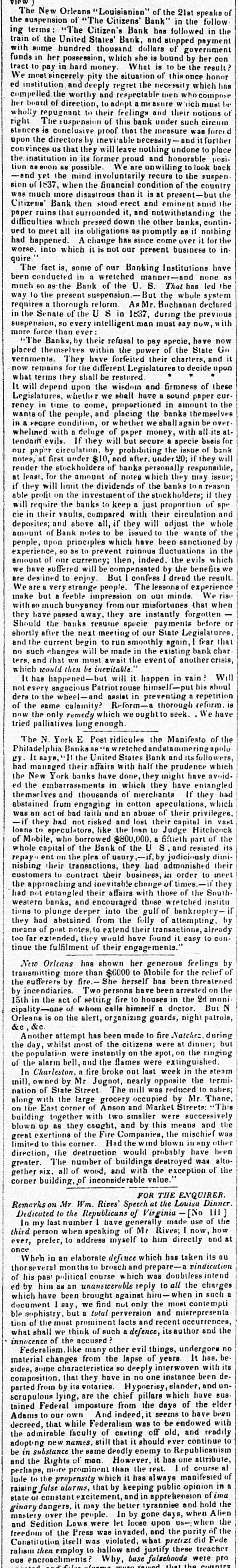 The New Orleans "Louisianian" of the 21st speaks of the suspension of "The Citizens' Bank" in the following terms: "The Citizen's Bank has followed in the train of the United States' Bank, and stopped payment with some hundred thousand dollars of government funds in her possession, which she is bound by her contract to pay in hard money. What is to be the result? We most sincerely pity the situation of this once honored institution and deeply regret the necessity which has compelled the worthy and respectable men who compose her board of direction, to adopt a measure which must be wholly repugnant to their feelings and their notions of right. The suspension of this bank under such circumstances is conclusive proof that the measure was forced upon the directors by inevitable necessity and it further convinces us that they will leave nothing undone to place the institution in its former proud and honorable position as soon as possible. We are unwilling to look back -and yet the mind involuntarily recurs to the suspension of 1837, when the financial condition of the country was much more disastrous than it is at present-but the Citizens' Bank then stood erect and eminent amid the paper ruins that surrounded it, and notwithstanding the difficulties which pressed down the other banks, continued to meet all its obligations as promptly as if nothing had happened. A change has since come over it for the worse. into which it is not our present business to inquire. The fact is, some of our Banking Institutions have been conducted in a wretched manner-and none as much so as the Bank of the U. S. That has led the way to the present suspension.-But the whole system requires a thorough reform. As Mr. Buchanan declared in the Senate of the US in 1837, during the previous suspension, so every intelligent man must say now, with more force than ever: "The Banks, by their refusal to pay specie, have now placed themselves within the power of the State Governments. They have forfeited their charters, and it now remains for the different Legislatures to decide upon what terms they shall be restored. It will depend upon the wisdom and firmness of these Legislatures, whether we shall have a sound paper currency in time to come, proportioned in amount to the wants of the people, and placing the banks themselves in a secure condition, or whether we shall again be overwhelmed with a deluge of paper money, with all its attendant evils. If they will but secure a specie basis for our paper circulation, by prohibiting the issue of bank notes, at first under $10, and after, under 20; if they will render the stockholders of banks personally responsible, at least, for the amount of notes which they may issue; if they will limit the dividends of the banks to a reasonable profit on the investment of the stockholders; if they will require the banks to keep a just proportion of specie in their vaults, compared with their circulation and deposites; and above all, if they will adjust the whole amount of Bank notes to be issued to the wants of the people, upon principles which have been sanctioned by experience, so as to prevent ruinous fluctuations in the amount of our currency; then, indeed, the evils which we have suffered will be compensated by the benefits we are destined to enjoy. But I confess I dread the result. We are a very strange people. The lessons of experience make but a feeble impression on our minds. We rise with so much buoyancy from our misfortunes that when they have passed away, they are instantly forgotten. Should the banks resume specie payments before or shortly after the next meeting of our State Legislatures, and the current begin to run smoothly again, I fear that no such changes will be made in the existing bank charters, and that we must await the event of another crisis, which would then be inevitable." It has happened but will it happen in vain? Will not every sagacious Patriot rouse himself-put his shoulders to the wheel-and assist in preventing a repetition of the same calamity? Reform-a thorough reform. is now the only remedy which we ought to seek. We have tried palliatives long enough. The N. York E Post ridicules the Manifesto of the Philadelphia Banks as "a wretched and stammering apology. It says, "If the United States Bank and its followers, had managed their affairs with half the prudence which the New York banks have done, they might have avoided the embarrassments in which they have entangled themselves and thousands of merchants If they had abstained from engaging in cotton speculations, which was an act of bad faith and an abuse of their privileges, -if they had not risked and lost their capital in vast loans to speculators, like the loan to Judge Hitchcock of Mobile, who borrowed $800,000, a fiftieth part of the whole capital of the Bank of the U S, and resisted its repayment on the plea of usury, if, by judiciously diminishing their transactions, they had admonished their customers to contract their business, in order to meet the approaching and inevitable change of times. if they had not entangled their affairs with those of the Southwestern banks, and encouraged those wretched institutions to plunge deeper into the gulf of bankruptcy-if they had abstained from the folly of attempting, by means of post notes, to extend their transactions, already too far extended, they would have found it easy to continue the fulfilment of their engagements." New Orleans has shown her generous feelings by transmitting more than $6000 to Mobile for the relief of the sufferers by fire. She herself has been threatened by incendiaries. Two persons have been arrested on the 15th in the act of setting fire to houses in the 2d municipality-one of whom calls himself a doctor. But N Orleans is on the alert, organizing guards, night patrols, &c, &c. Another attempt has been made to fire Natchez, during the day, whilst most of the citizens were at dinner; but the population were instantly on the spot, on the