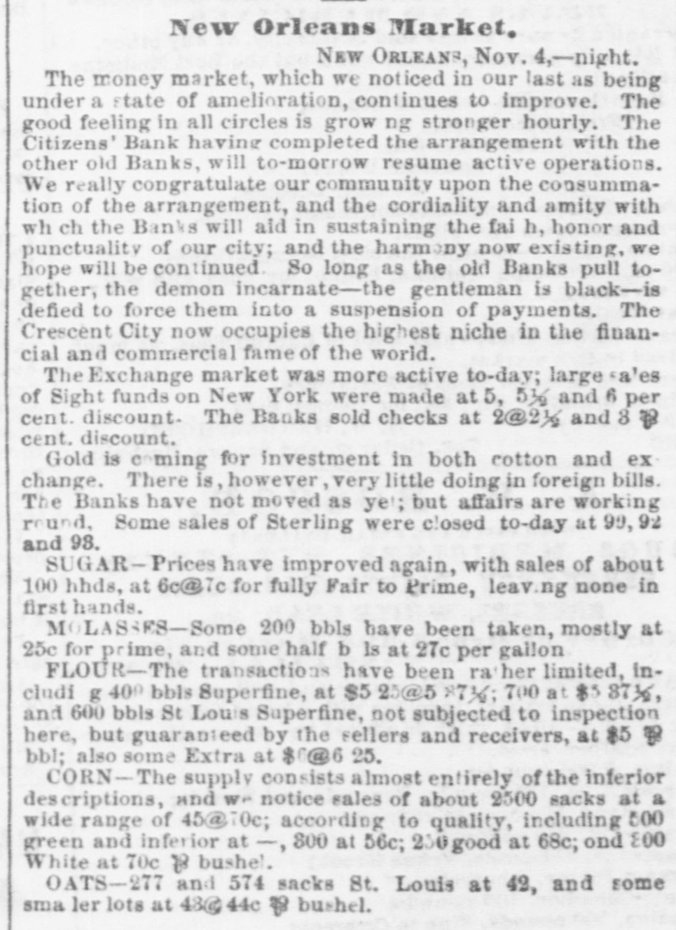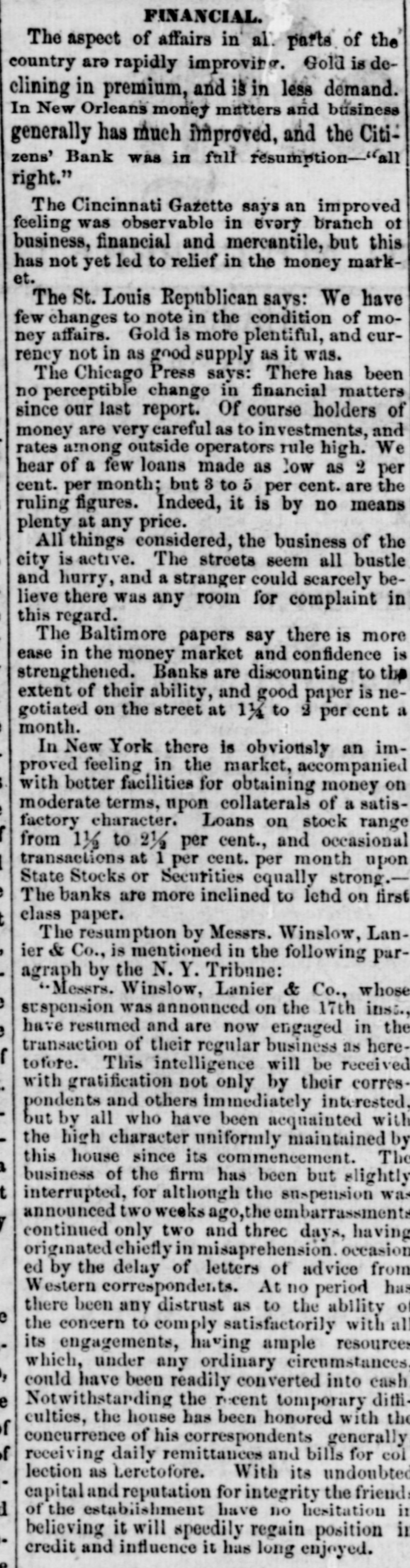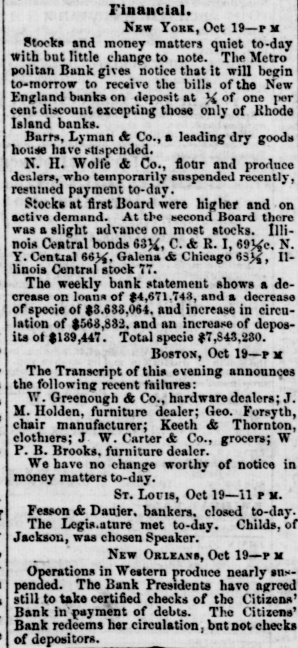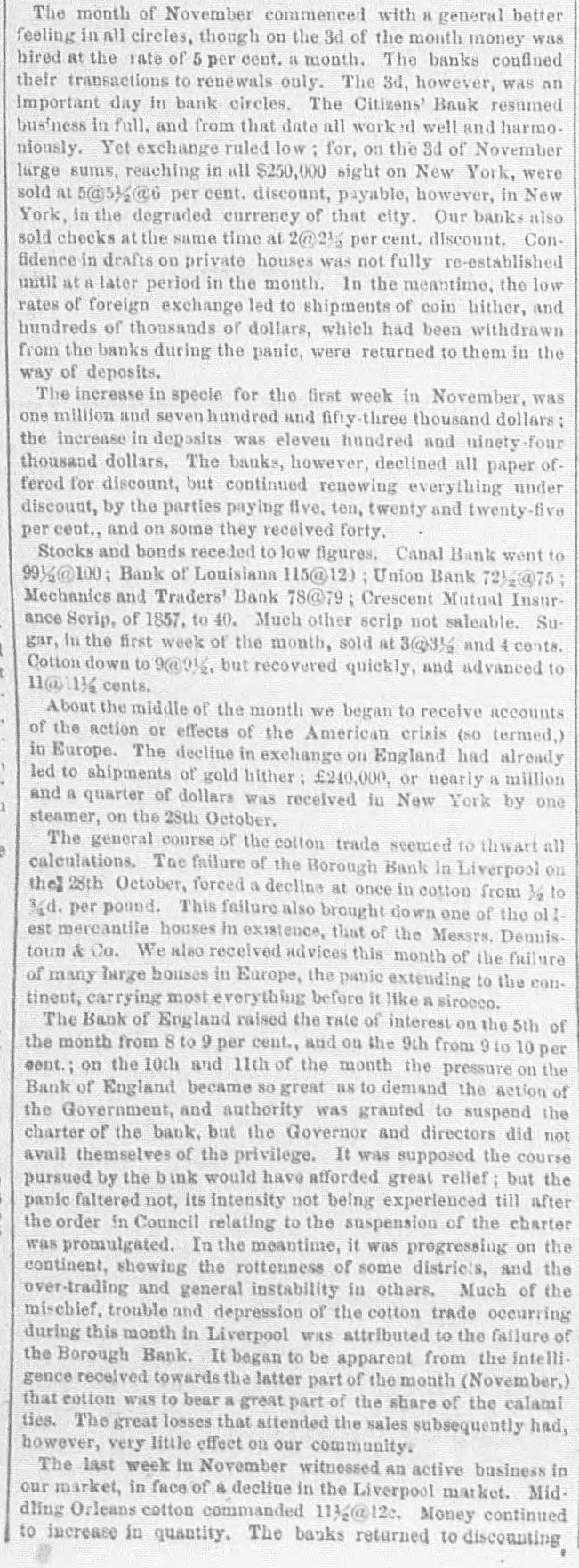 60 days best bills, per cent discount, and commercial, discount, with loans of money being made at the rate of month. ner telegraph hourly brought accounts of the intensity and of the panic in distant cities. Our absent citizens rein numbers, giving dubious and doleful accounts of the financial condition of the country: Cotton arrived but was almost unsaleable, so much SO that factors had for foreign exchange, which they passed to the backs of their obligations. Parties who had been pr d+ denouncing the banks for their incapability of pure' 488change or extending discounts became still more c' amornouncing in unmeasured terms the course pursur d by the which course afterward proved to have beer the salva. our city. Stocks and bonds were almost unsaleable receded to 74 and 75 Bank of Louis Jana stock was 115@120. 13th October, we wrote as follo WS: "There is very be said about the money market this evening a large our community, instead of at sending to its own immeaffairs, are watching the tel sgraphic wires. This is unwe said three weeks "ince that 27 out of the 54 banks of New York, would suspend, and the advices this state 17 had suspended. This was not unexpected, and useless for parties to endeavor to create the im that these suspensions were not expected. We have along that we should receive the most unfavorable acor rather that bank suspensions and failures In Northern night ba considered a fixed fact." minor banks in New York began to close their doors, as their vaults on the 11th of the month, followed on the some of the larger ones. On the 13th 8 general run on all the banks, and Wall street was an excited which resulted in R general suspension of coin paywith the exception of one bank-the Chemical. Thus stood bankrupted, what else could have been expected followed the previous wild course and mismanagement of in expanding discounts to the extent of one hundred venty-two millions of dollars, one specie basis of the trifling of twelve millions of dollars, and then foreing curtailreduction to an amount exceeding twenty-tv millions in the short period of eight weeks, when the produce country could not be used. he meantime, say about the 10th of October, there had slent withdrawal of deposits from some of our banks, of their circulation being presented. This was folwith considerable briskness on the 12th and 13th. On of the 14th, intelligence was received here of the suspension of the New York Banks. And on the same some of our free banks could not liquidate their balwith the old chartered banks, which led to a reluctant rereceive the issues of three. The chartered banks were with a run, which had already commenced on the Bank, the Bank of NewOrleans and the Mechanics' and Bank, which led to a close of the doors of these instiuntil the following day. The closing of the doors of was forced on then by the action of depositors the bill holders at large did not take the alarm till the day. On the evening of the 14th, the run on the Citicommenced, which was continued the following day; day, the 15th, the run commenced on all the banks, Southern Bank, Louisiana State Bank, Bank of Louisiana, Bank and Bank of James Robb. On the Citizens' Bank the peared of the wildest kind, and we might say the poputhose who had a dollar on deposit, or held a note, were The brunt of the run was on this Bank, from what not to this day been learned. Its great popularity, its management, its liberality to the public the great which had attended its course the high value of $160; its connection with the State, through which over of dollars in bonds were to be liquidated its nuquessolvency-all, all were considered as naught, and a and unparalleled run commenced on the 14th of Octocontinued during the 15th, up to the close of which one million of dollars were paid out. The annals of do not contain another such instance of unprovoked and for assault, and one which was met with 80 much and alacrity. Though a temporary suspension to depositors followed, it must not be forgotten that alone was the panic against this bank mainly about. The same remark will apply to the three free which were forced temporarily to suspend. As to the dewe have yet to learn of a solitary indivi Jual who lost a is no doubt but the panic received its chief impetus discrediting of the notes of the three free banks on the was deemed A measure of prudence and safety to the themselves, for it was manifest that they had HS much could do to protect themselves and carry out their duties depositors and it was not known at what hour the burst on our ci y, Coupled with the refusal of the the accounts of the stoppage of the banks of New which came to hand the same hour. So much was said regarding the compulsory action of the old banks, to the course pursued towards the free banks S to, that it is not out of place to remark that some of been in arrears for a week or ten days previous to the a October. D close of the 15th, it was pretty well ascertained that f fear had done its worst. On the evening of that day, in our monetary column, as follows tl panic which started yesterday in our midst, with0 just cause, without reason, without shadow of found. and attained its colminating point to-day. Whatc consequences may be. we have the sincere gratification 3 uncing that the following banks stood the run and e complied with every demand until the usual hour of Citizens' Bank, Canal Bank, Bank of Louisiana, Lou1 Bank, Southern Bank. and Bank of James Robb. 1 Orleans Saving Institution, Canal street, was densely 5. at an early hour. It met all obligations according to and by 12 o'clock there was not a person present. This a The Mechanics' and raders Bank opened, and regular business, with the exception of redeeming So did the Union. The Bank of New Orleans in at the suit of one of its Directors. This is singular. e that the occurrences of the past two days will tend P confidence in the future, is not warranted. We concrisis is now past that the worst has bee