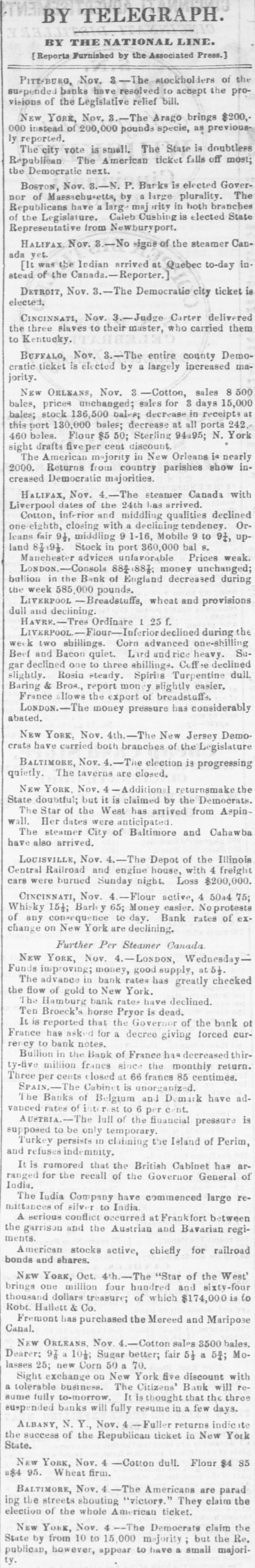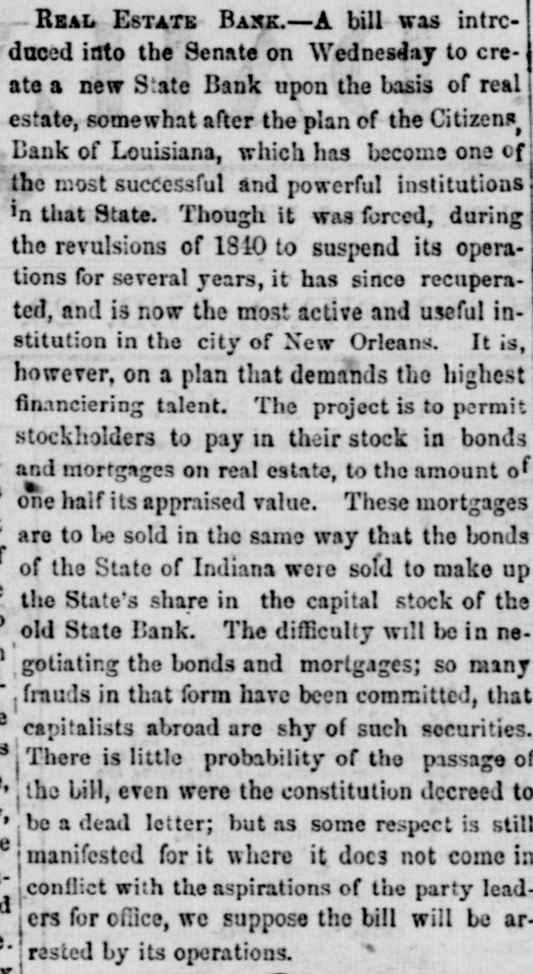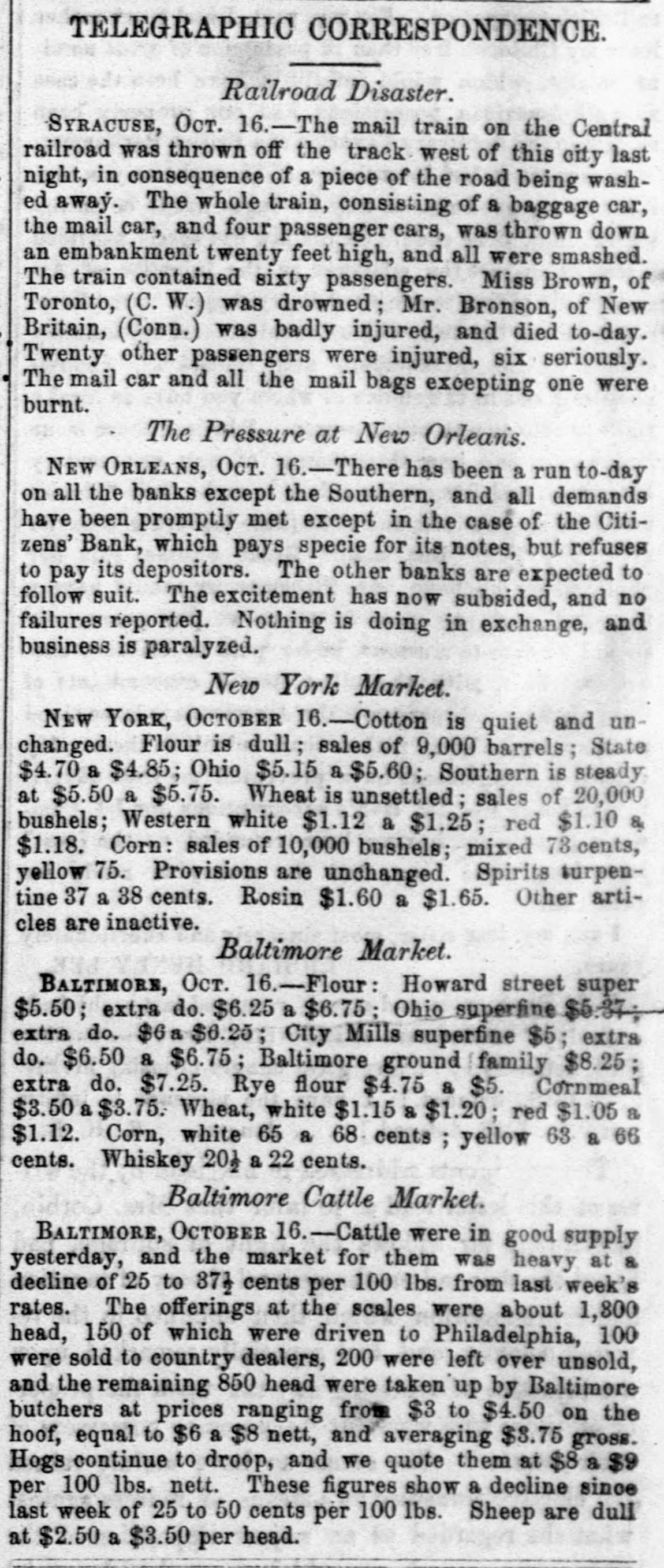60 days best bills, per cent discount, and commercial, discount, with loans of money being made at the rate of month. ner telegraph hourly brought accounts of the intensity and of the panic in distant cities. Our absent citizens rein numbers, giving dubious and doleful accounts of the financial condition of the country: Cotton arrived but was almost unsaleable, so much SO that factors had for foreign exchange, which they passed to the backs of their obligations. Parties who had been pr d+ denouncing the banks for their incapability of pure' 488change or extending discounts became still more c' amornouncing in unmeasured terms the course pursur d by the which course afterward proved to have beer the salva. our city. Stocks and bonds were almost unsaleable receded to 74 and 75 Bank of Louis Jana stock was 115@120. 13th October, we wrote as follo WS: "There is very be said about the money market this evening a large our community, instead of at sending to its own immeaffairs, are watching the tel sgraphic wires. This is unwe said three weeks "ince that 27 out of the 54 banks of New York, would suspend, and the advices this state 17 had suspended. This was not unexpected, and useless for parties to endeavor to create the im that these suspensions were not expected. We have along that we should receive the most unfavorable acor rather that bank suspensions and failures In Northern night ba considered a fixed fact." minor banks in New York began to close their doors, as their vaults on the 11th of the month, followed on the some of the larger ones. On the 13th 8 general run on all the banks, and Wall street was an excited which resulted in R general suspension of coin paywith the exception of one bank-the Chemical. Thus stood bankrupted, what else could have been expected followed the previous wild course and mismanagement of in expanding discounts to the extent of one hundred venty-two millions of dollars, one specie basis of the trifling of twelve millions of dollars, and then foreing curtailreduction to an amount exceeding twenty-tv millions in the short period of eight weeks, when the produce country could not be used. he meantime, say about the 10th of October, there had slent withdrawal of deposits from some of our banks, of their circulation being presented. This was folwith considerable briskness on the 12th and 13th. On of the 14th, intelligence was received here of the suspension of the New York Banks. And on the same some of our free banks could not liquidate their balwith the old chartered banks, which led to a reluctant rereceive the issues of three. The chartered banks were with a run, which had already commenced on the Bank, the Bank of NewOrleans and the Mechanics' and Bank, which led to a close of the doors of these instiuntil the following day. The closing of the doors of was forced on then by the action of depositors the bill holders at large did not take the alarm till the day. On the evening of the 14th, the run on the Citicommenced, which was continued the following day; day, the 15th, the run commenced on all the banks, Southern Bank, Louisiana State Bank, Bank of Louisiana, Bank and Bank of James Robb. On the Citizens' Bank the peared of the wildest kind, and we might say the poputhose who had a dollar on deposit, or held a note, were The brunt of the run was on this Bank, from what not to this day been learned. Its great popularity, its management, its liberality to the public the great which had attended its course the high value of $160; its connection with the State, through which over of dollars in bonds were to be liquidated its nuquessolvency-all, all were considered as naught, and a and unparalleled run commenced on the 14th of Octocontinued during the 15th, up to the close of which one million of dollars were paid out. The annals of do not contain another such instance of unprovoked and for assault, and one which was met with 80 much and alacrity. Though a temporary suspension to depositors followed, it must not be forgotten that alone was the panic against this bank mainly about. The same remark will apply to the three free which were forced temporarily to suspend. As to the dewe have yet to learn of a solitary indivi Jual who lost a is no doubt but the panic received its chief impetus discrediting of the notes of the three free banks on the was deemed A measure of prudence and safety to the themselves, for it was manifest that they had HS much could do to protect themselves and carry out their duties depositors and it was not known at what hour the burst on our ci y, Coupled with the refusal of the the accounts of the stoppage of the banks of New which came to hand the same hour. So much was said regarding the compulsory action of the old banks, to the course pursued towards the free banks S to, that it is not out of place to remark that some of been in arrears for a week or ten days previous to the a October. D close of the 15th, it was pretty well ascertained that f fear had done its worst. On the evening of that day, in our monetary column, as follows tl panic which started yesterday in our midst, with0 just cause, without reason, without shadow of found. and attained its colminating point to-day. Whatc consequences may be. we have the sincere gratification 3 uncing that the following banks stood the run and e complied with every demand until the usual hour of Citizens' Bank, Canal Bank, Bank of Louisiana, Lou1 Bank, Southern Bank. and Bank of James Robb. 1 Orleans Saving Institution, Canal street, was densely 5. at an early hour. It met all obligations according to and by 12 o'clock there was not a person present. This a The Mechanics' and raders Bank opened, and regular business, with the exception of redeeming So did the Union. The Bank of New Orleans in at the suit of one of its Directors. This is singular. e that the occurrences of the past two days will tend P confidence in the future, is not warranted. We concrisis is now past that the worst has bee