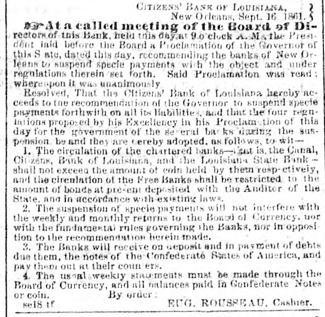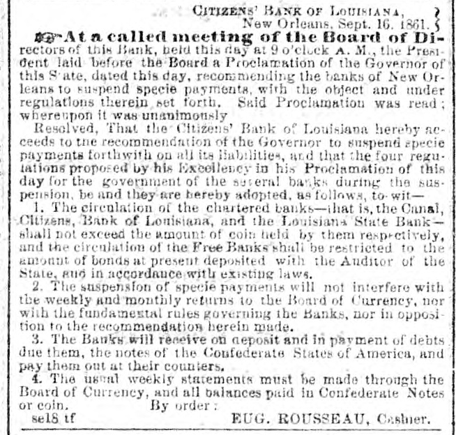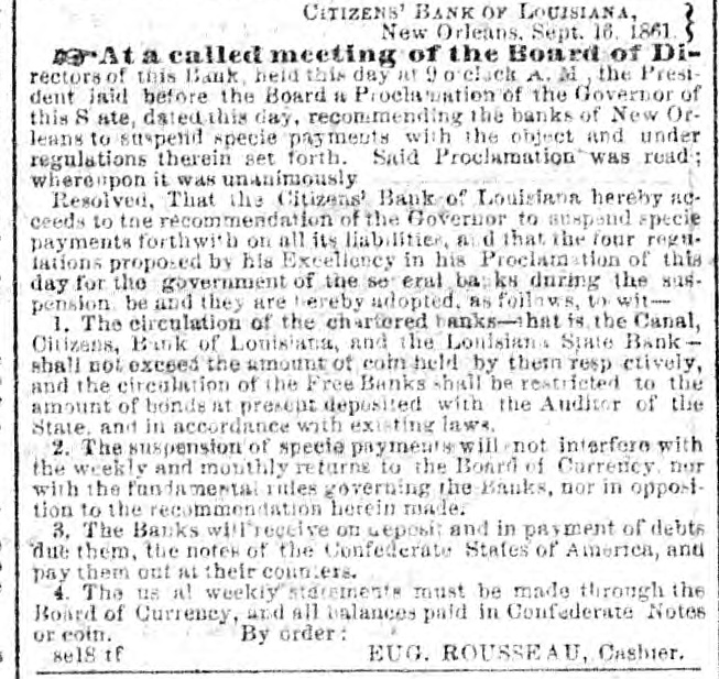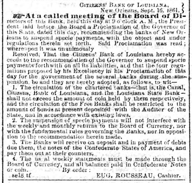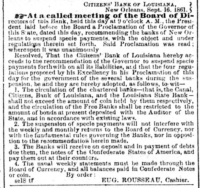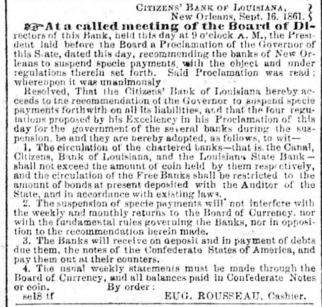 CITIZENS' BANK OF LOUISIANA, New Orleans, Sept. 16. 1861. At a called meeting of the Board of DIrectors of this Bank, held this day at 9 o'clock A. M., the President laid before the Board a Proclamation of the Governor of this State, dated this day, recommending the banks of New Orleans to suspend specie payments, with the object and under regulations therein set forth. Said Proclamation was read whereapon it was unanimously Resolved, That the Citizens' Bank of Louisiana hereby acceeds to the recommendation of the Governor to suspend specie payments forthwith on all its liabilities, and that the four regulations proposed by his Excellency in his Proclamation of this day for the government of the several banks during the suspension, be and they are hereby adopted, as follows, to wit1. The circulation of the chartered banks-that is the Canal, Citizens, Bank of Louisiana, and the Louisians State Bank shall not exceed the amount of coin held by them respectively, and the circulation of the Free Banks shall be restricted to the amount of bonds at present deposited with the Anditor of the State, and in accordance with existing laws. 2. The suspension of specie payments will not interfere with the weekly and monthly returns to the Board of Currency. nor with the fandamestal rules governing the Banks, nor in opposition to the recommendation herein made. 3. The Banks will receive on deposit and in payment of debts due them, the notes of the Confederate States of America, and pay them out at their counters. 4. The usual weekly statements must be made through the Board of Currency, and all balances paid in Confederate Notes or coin. By order: se18 tf EUG. ROUSSEAU, Cashier.