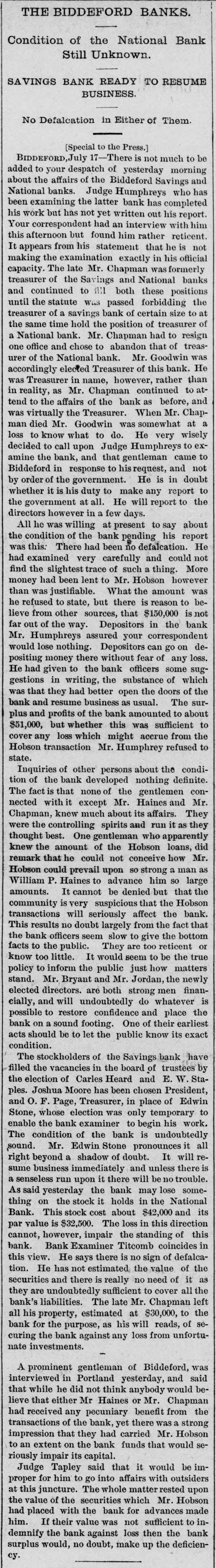 THE BIDDEFORD BANKS. Condition of the National Still Unknown. SAVINGS BANK READY TO RESUMI BUSINESS. No Defalcation in Either of Them. [Special to the Press.] BIDDEFORD, 17-There is not much to added to your despatch of yesterday mornin about the affairs of the Biddeford Savings National banks. Judge Humphreys who been examining the latter bank has complete his work but has not yet written out his repor Your correspondent had an interview with this afternoon but found him rather reticen It appears from his statement that he is making the examination exactly in his officia capacity. The late Mr. Chapman was formerly treasurer of the Savings and National and continued to fill both these position until the statute Was passed forbidding treasurer of a savings bank of certain size to the same time hold the position of treasurer a National bank. Mr. Chapman had to resig one office and chose to abandon that of urer of the National bank. Mr. Goodwin accordingly elected Treasurer of this bank. was Treasurer in name, however, rather tha in reality, as Mr. Chapman continued to tend to the affairs of the bank as before, was virtually the Treasurer. When Mr. man died Mr. Goodwin was somewhat at loss to know what to do. He very wisel decided to call upon Judge Humphreys to amine the bank, and that gentleman came Biddeford in response to his request, and by order of the government. He is in whether it is his duty to make any report the government at all. He will report to directors however in a few days. All he was willing at present to say the condition of the bank pending his was this: There had been no defalcation. had examined very carefully and could find the slightest trace of such a thing. money had been lent to Mr. Hobson howeve than was justifiable. What the amount he refused to state, but there is reason to lieve from other sources, that $150,000 is far out of the way. Depositors in the Mr. Humphreys assured your corresponder would lose nothing. Depositors can go on positing money there without fear of any