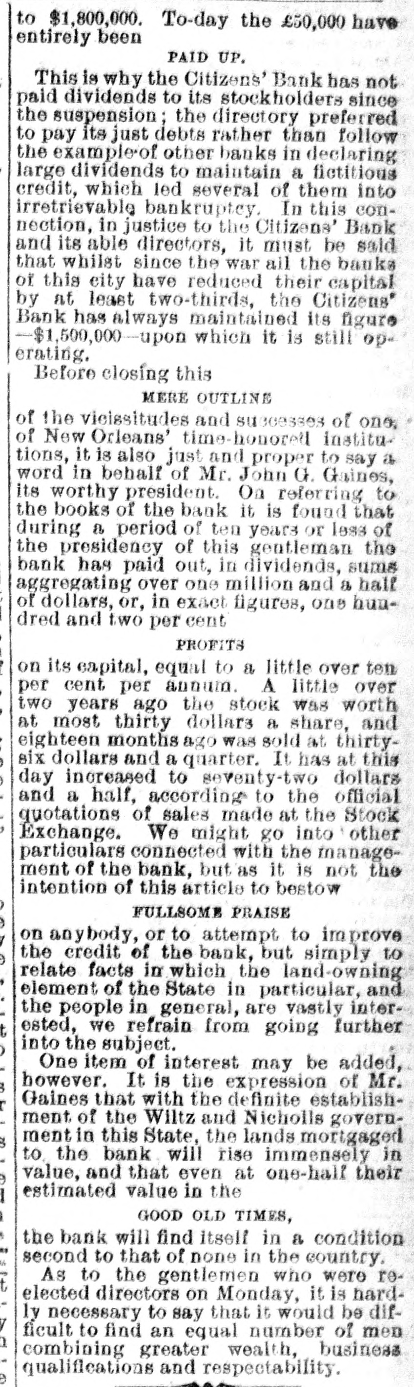 to $1,800,000. To-day the £50,000 have entirely been PAID UP. This is why the Citizens' Bank has not : paid dividends to its stockholders since the suspension; the directory preferred to pay its just debts rather than follow the example of other banks in declaring large dividends to maintain a fictitious credit, which led several of them into irretrievable bankruptcy. In this connection, in justice to the Citizens' Bank and its able directors, it must be said that whilst since the war all the banks of this city have reduced their capital by at least two-thirds, the Citizens' Bank has always maintained its figure -$1,500,000-upon which it is still op= erating. Before closing this MERE OUTLINE of the vieissitudes and successes of one, of New Orleans' time-honorell institutions, it is also just and proper to say a word in behalf of Mr. John G. Gaines, its worthy president. On referring to the books of the bank it is found that during a period of ten years or less of the presidency of this gentleman the bank has paid out, in dividends, sums aggregating over one million and a half ; of dollars, or, in exact figures, one hundred and two per cent PROFITS E on its capital, equal to a little over ten per cent per annum. A little over two years ago the stock was worth at most thirty dollars a share, and : eighteen months ago was sold at thirty) six dollars and a quarter. It has at this ) day increased to seventy-two dollars and a half, according to the official quotations of sales made at the Stock , Exchange. We might go into other particulars connected with the management of the bank, but as it is not the intention of this article to bestow FULLSOME PRAISE on anybody, or to attempt to improve 7 the credit of the bank, but simply to ) relate facts in which the land-owning , element of the State in particular, and the people in general, are vastly interested, we refrain from going further t into the subject. ) One item of interest may be added, however. It is the expression of Mr. 3 Gaines that with the definite establishr ment of the Wiltz and Nicholls government in this State, the lands mortgaged 3 to the bank will rise immensely in value, and that even at one-half their e estimated value in the I ) GOOD OLD TIMES, the bank will find itself in a condition second to that of none in the country. its As to the gentlemen who were ret elected directors on Monday, it is hardly necessary to say that it would be dify ficult to find an equal number of men a combining greater wealth, business qualifications and respectability. e