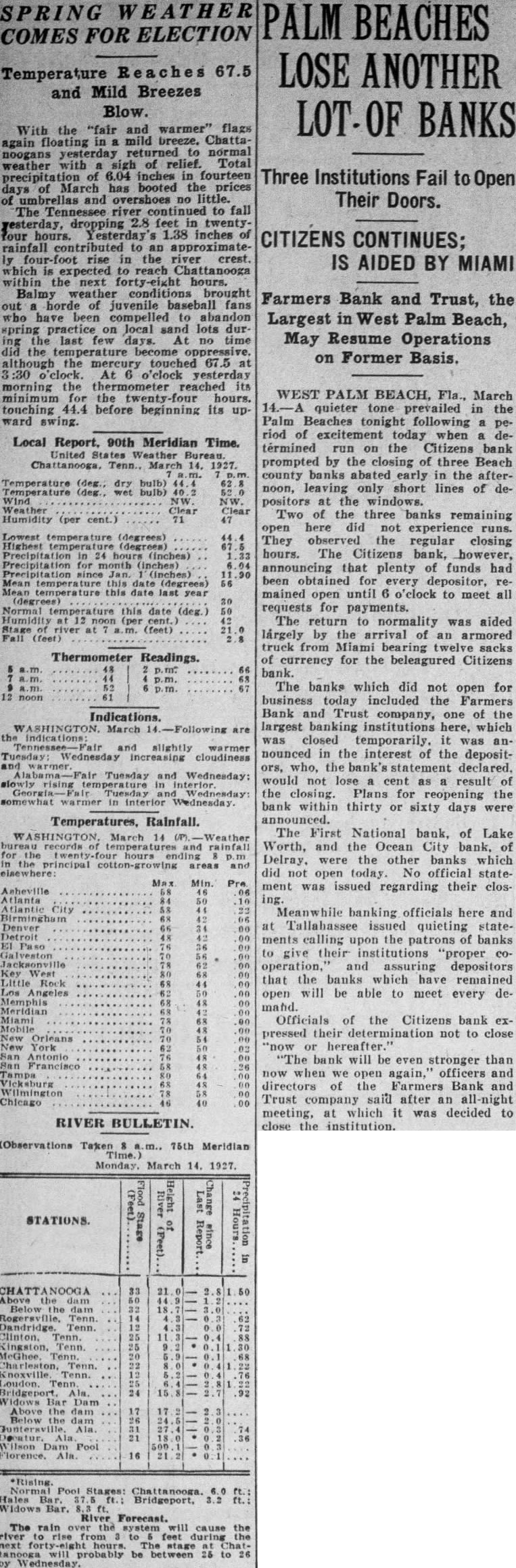 SPRING WEATHER COMES FOR ELECTION Temperature Reaches 67.5 and Mild Breezes Blow. With the "fair and warmer" flags again floating in mild breeze. Chattanoogans yesterday returned normal weather with relief. Total 6.04 inches fourteen days of March has booted the prices of and overshoes no little. The river to fall yesterday, dropping 2.8 feet in twentyfour hours. Yesterday's 1.38 inches of rainfall contributed to an approximatefour-foot rise in the river crest. which reach Chattanooga within the next forty-eight hours. Balmy conditions brought out horde juvenile baseball fans have been compelled to abandon spring practice on local sand lots dur last days. no time did the temperature become although the touched 67.5 o'clock. At o'clock morning the reached its minimum the hours. touching before beginning its up swing. Indications. March are and warmer Tuesday: Wednesday increasing cloudiness Tuesday Wednesday: Wednesday Temperatures, Rainfall. (Observations Taken Meridian March 14. Local Report. 90th Meridian Time. United Weather Bureau. March bulb) bulb) Clear Humidity (per cent.) Lowest temperature (degrees) Highest (inches) temperature this date last year Humidity (feet) (feet) Thermometer Readings. The First National bank. of Lake Worth, and the Ocean City bank, of Delray. were the other banks which did not open today No official stateMax Min. ment was issued regarding their closbanking officials here and at Tallabassee issued quieting statements calling upon the patrons of banks to give their institutions "proper cooperation, and assuring depositors that banks which have remained Angeles open will be able to meet every deOfficials of the Citizens bank expressed their determination to close Orleans "now hereafter.' bank will be even stronger than Francisco now when open again,' officers and directors the Farmers Bank and Trust company said after an all-night Chicago meeting, which it was decided to RIVER BULLETIN. close the institution. STATIONS. Tenn. Pool Pool Stages: River Forecast. The river probably