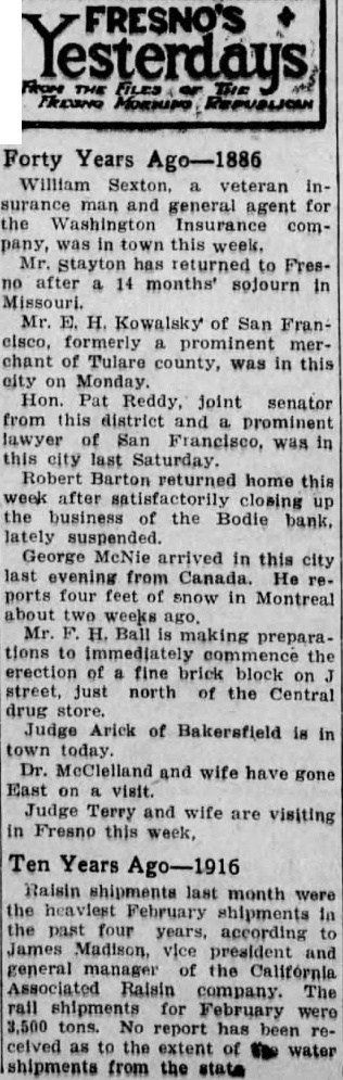 Forty Years William veteran surance man and general agent the Washington Insurance town returned to Fresafter months' sojourn Missouri. Mr. Kowalsky of San Franelsco, formerly prominent chant of Tulare county, was Monday. Hon. Reddy, joint senator from this district and prominent lawyer San Francisco, city last Robert returned home this after satisfactorily closing up the business the Bodie bank. suspended. George McNie arrived in this city evening four snow in Montreal Mr. tions erection fine block street, north the Central drug Judge Arick of Bakersfield today. McClelland and wife have gone East visit. Judge Terry and wife are visiting in Fresno this week, Years Raisin shipments month shipments the past four according James Madison, vice president general manager the California Associated Raisin company. shipments for February tons. report has extent shipments from the