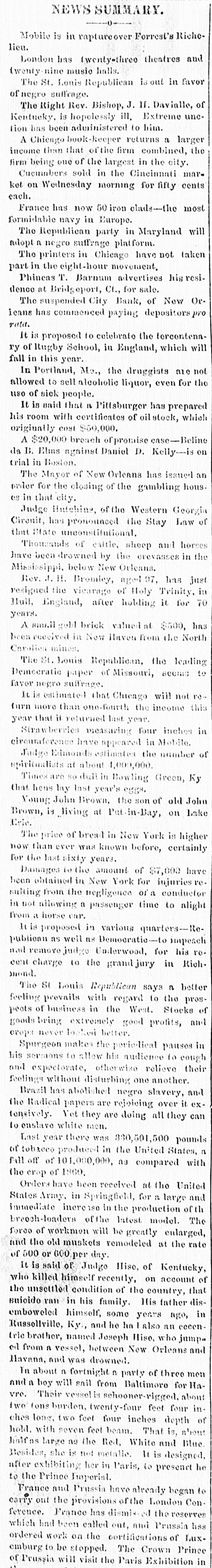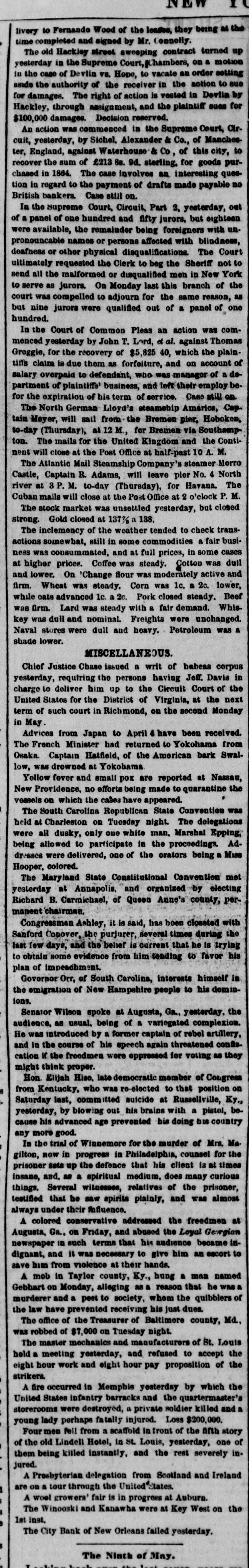 I NEW e livery to Fernando Wood of the leases, they being as the time completed and signed by Mr. Connolly. The old Hackley street sweeping contract turned up yesterday in the Supreme Court, Chambers, on a motion in the case of Devlin vs. Hope, to vacate an order setting aside the authority of the receiver in the action to sue for damages. The right of action is vested in Devila by Hackley, through assignment, and the plaintiff sues for $100,000 damages. Decision reserved. An action was commenced in the Supreme Court, Clr. cuit, yesterday, by Sichel, Alexander & Co., of Manches ter, England, against Waterhouse & Co, of this city, to recover the sum of £213 88. 9d. sterling, for goods purchased in 1864. The case involves an interesting question in regard to the payment of drafts made payable no British bankers. Case still on. In the Supreme Court, Circuit, Part 2, yesterday, out of a panel of one hundred and fifty jurors, but eighteen were available, the remainder being foreigners with unpronouncable names or persons affected with blindness, doafness or other physical disqualifications. The Court ultimately requested the Clerk to beg the Sheriff not to send all the malformed or disqualified men in New York to serve as jurors. On Monday last this branch of the court was compelled to adjourn for the same reason, as but nine jurors were qualified out of a panel of one hundred. In the Court of Common Pleas an action was commenced yesterday by John T. Lord, et al. against Thomas Greggie, for the recovery of $5,825 40, which the plain tiffs claim is due them as forfeiture, and on account of salary overpaid to defendant, who was manager of a department of plaintiffs' business, and left their employ be. for the expiration of his term of service. Caso still on The North German Lloyd's steamship America, Cap tain Meyer, will sail from the Bremen pier, Hoboken, to-day (Thursday), al 12 M. for Bremen via Southamp ton. The mails for the United Kingdom and the Conti nent will close at the Post Office at half-past 10 M. The Atlantic Mail Steamship Company's steamer Morro Castle, Captain R. Adams, will leave pier No. 4 North river at 3 P. M. to-day (Thursday), for Havana. The Cuban mails will close at the Post Office at 2 o'clock P. M. The stock market was unsettled yesterday, but closed strong. Gold closed at 137% a 138. The inclemency of the weather tended to check transactions somewhat, still in some commodities a fair business was consummated, and at full prices, in some cases at higher prices. Coffee was steady. Cotton was dull and lower. On 'Change flour was moderately active and firm. Wheat was steady. Corn was 1c. a 2c. lower, while oats advanced 1c. 2c. Pork closed steady. Beef was firm. Lard was steady with a fair demand. Whis key was dull and nominal. Freights were unchanged. Naval stores were dull and heavy. Petroleum was a shade lower. MISCELLANEOUS. Chief Justice Chase issued a writ of habeas corpus yesterday, requiring the persons having Jeff. Davis in charge to deliver him up to the Circuit Court of the United States for the District of Virginia, at the next term of such court in Richmond, on the second Monday in May Advices from Japan to April 4 have been received The French Minister had returned to Yokohama from Osaka. Captain Hatfield, of the American bark Swal. low, was drowned at Yokobama Yellow fever and small pox are reported at Nassau, New Providence, no efforts being made to quarantine the vessels on which the cases have appeared. The South Carolina Republican State Convention was held at Charleston on Tuesday night. The delegations were all dusky, only one white man. Marshal Epping, being allowed to participate in the proceedings. Ad. dresses were delivered, one of the orators being a Miss Hooper. colored. The Maryland State Constitutional Convention met yesterday at Annapolis, and organized by electing Richard B. Carmichael, of Queen Anne's county, permanent chairman Congressman Ashley, it is said, has been closeted with Sanford Conover, the purjurer, several times during the last few days, and the belief is current that he is trying to obtain some evidence from him sending to favor his plan of impeachment. Governor Orr, of South Carolina, interests himself in the emigration of New Hampshire people to his dominions. Senator Wilson spoke at Augusta, Ga. yesterday. the audience, as usual. being of a variegated complexion. He was introduced by a former captain of rebel artillery, and in the course of his speech again threatened confiscation IC the freedmen were oppressed for voting as they might think proper. Hon Elijah Hise, late democratic member of Congress from Kentucky, who was re-elected to that position on Saturday last, committed suicide at Russellville, Ky. yesterday, by blowing out his brains with a pistol, because his advanced age prevented bis doing bis country any more good. In the trial of Winnemore for the murder of Mrs. Ma gilton, now in progress in Philadelphia, counsel for the prisoner sets up the defence that his client is at times insane, and, as a spiritual medium, does many curious things. Several witnesses, relatives of the prisoner, testified that be saw spirits plainly, and was almost always under their Influence. A colored conservative addressed the freedmen at Augusta, Ga. on Friday, and abused the Loyal Genrigian newspaper in such terms that his audience became indignant, and it was necessary to give him an escort to save him from violence at their hands. A mob in Taylor county, Ky., hung a man named Gebhart on Monday, alleging as a reason that he was murderer and pest to society, whom the quibblers of the law have prevented receiving his just dues. The office of the Treasurer of Baltimore county, Md. was robbed of $7,000 on Tuesday night. The master mechanics and manufacturers of St. Louis held a meeting yesterday, and refused to accept the eight hour work and eight hour pay proposition of the strikers. A fire occurred in Memphis yesterday by which th