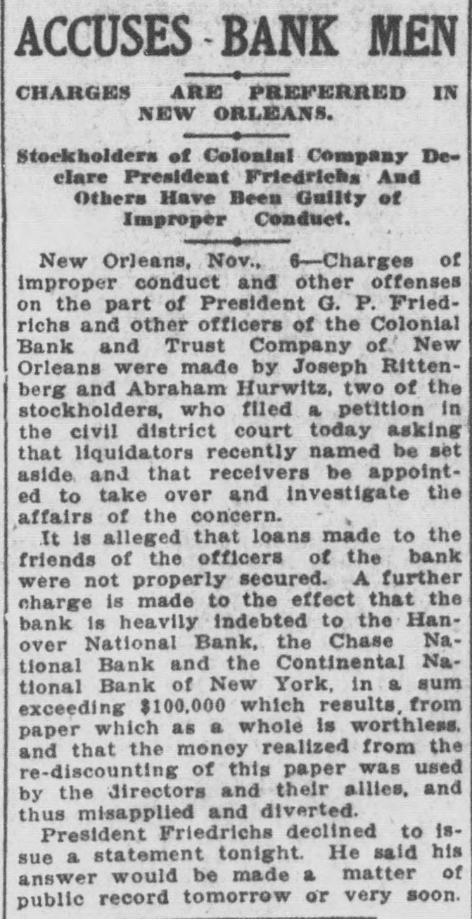 ACCUSES - BANK MEN CHARGES ARE PREFERRED IN NEW ORLEANS. Stockholders of Colonial Company Declare President Friedrichs And Others Have Been Guilty of Improper Conduct. / of New Orleans, Nov., 6-Charges improper conduct and other offenses on the part of President G. P. Friedrichs and other officers of the Colonial Bank and Trust Company of New Orleans were made by Joseph Rittenberg and Abraham Hurwitz, two of the stockholders, who filed a petition in the civil district court today asking that liquidators recently named be set aside and that receivers be appointed to take over and investigate the affairs of the concern. It is alleged that loans made to the friends of the officers of the bank were not properly secured. A further charge is made to the effect that the bank is heavily indebted to the Hanover National Bank, the Chase National Bank and the Continental National Bank of New York, in a sum exceeding $100,000 which results, from paper which as a whole is worthless. and that the money realized from the re-discounting of this paper was used by the directors and their allies, and thus misapplied and diverted. President Friedrichs declined to issue a statement tonight. He said his answer would be made a matter of public record tomorrow or very soon.