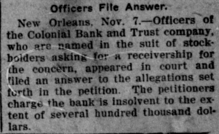 Officers File Answer. New Orleans, Nov. 7.-Officers of the Colonial Bank and Trust company, who are named in the suit of stockholders asking for a receivership for the concern, appeared in court and filed an answer to the allegations set forth in the petition. The petitioners charge the bank is insolvent to the extent of several hundred thousand dollars.