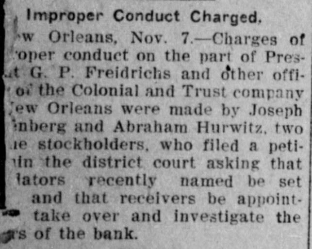 Improper Conduct Charged, W Orleans, Nov. 7.-Charges of oper conduct on the part of Prest G. P. Freidrichs and other offi01 the Colonial and Trust company ew Orleans were made by Joseph inberg and Abraham Hurwitz, two 1e stockholders, who filed a petiin the district court asking that lators recently named be set and that receivers be appointtake over and investigate the TS of the bank.