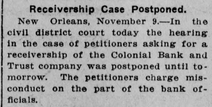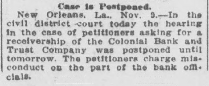 Case is Postponed. New Orleans, La.. Nov. 9.-In the civil district court today the hearing in the case of petitioners asking for a receivership of the Colonial Bank and Trust Company was postponed until tomorrow. The petitioners charge misconduct on the part of the bank off. cials.