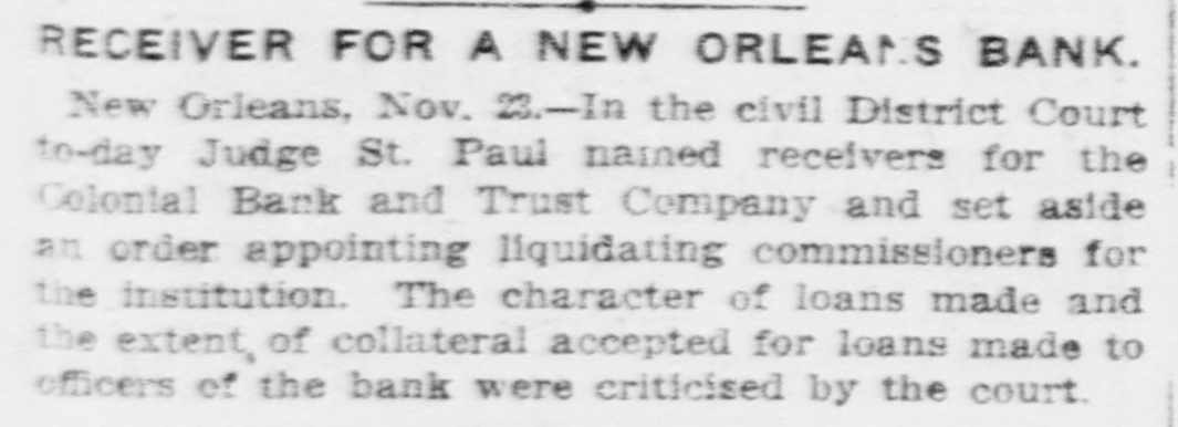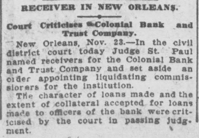 RECEIVER IN NEW ORLEANS. Court Criticises a Colonial Bank and Trust Company. New Orleans, Nov. 23.-In the civil district court today Judge St. Paul named receivers for the Colonial Bank and Trust Company and set aside an order appointing liquidating commissiorers for the institution. The character of loans made and the extent of collateral accepted for loans made to officers of the bank were criticised by the court in passing judg. ment.
