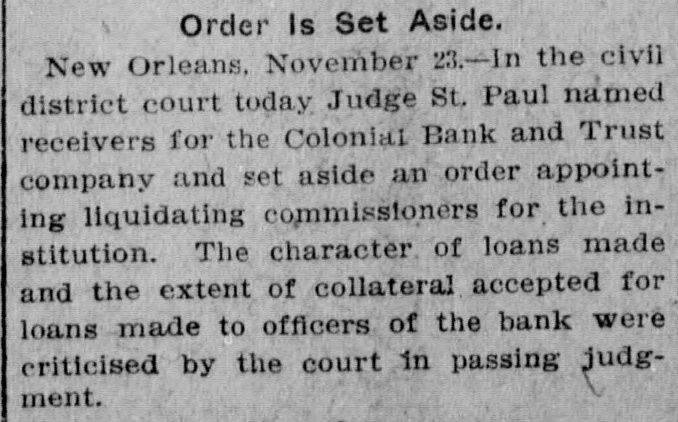 Order Is Set Aside. New Orleans, November 23.-In the civil district court today Judge St. Paul named receivers for the Colonial Bank and Trust company and set aside an order appointing liquidating commissioners for the institution. The character. of loans made and the extent of collateral accepted for loans made to officers of the bank were criticised by the court in passing judgment.