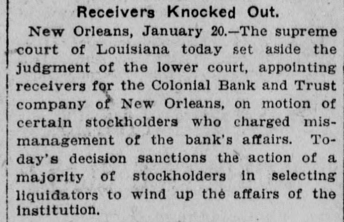 Receivers Knocked Out. New Orleans, January 20.-The supreme court of Louisiana today set aside the judgment of the lower court, appointing receivers for the Colonial Bank and Trust company of New Orleans, on motion of certain stockholders who charged mismanagement of the bank's affairs. Today's decision sanctions the action of a majority of stockholders in selecting liquidators to wind up the affairs of the institution.